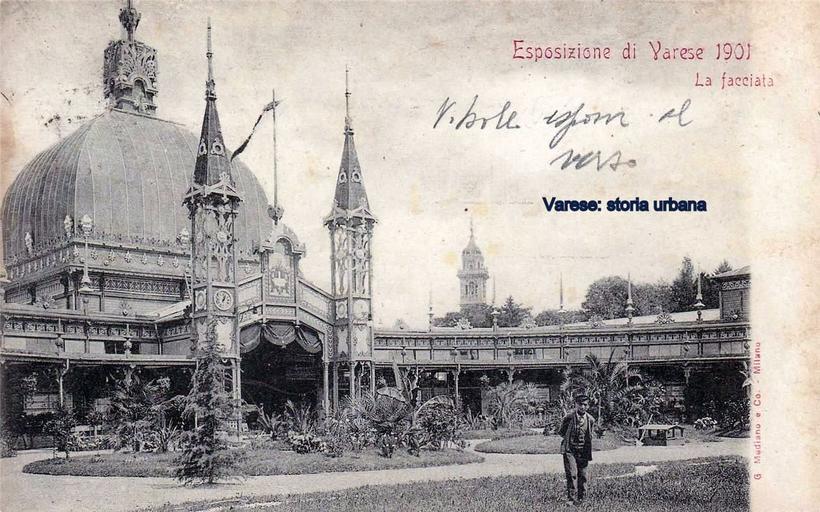 Keywords: La grande cupola ed i padiglioni, alle spalle il campanile di San Vittore. varese giardinipubblici esposizione1901
