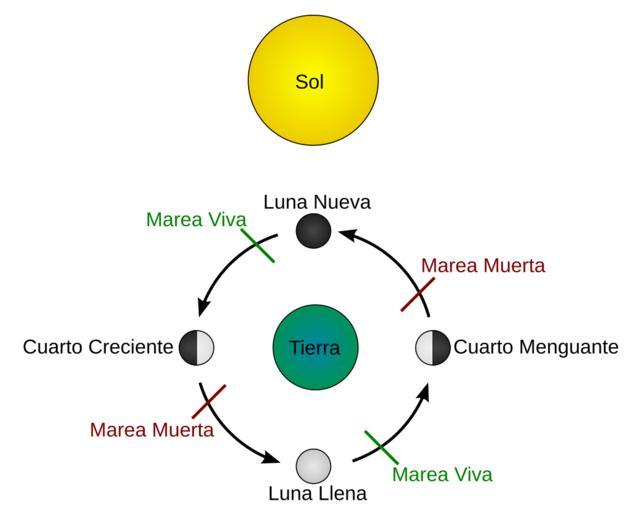 | Keywords: Esquema-mareas.svg en Tides schematic Due to the bathymetry of some areas neap and spring tides reach their maximum force 2 days after the first quarter moon third quarter moon and new moon full moon respectively In the absence of complications due to bathymetry spring tides are exactly at the full and new moons and neap tides are exactly at the one-quarter and three-quarter moon Every six hours the water also lowers or heightens; as such four tides are created Low water spring tide<br/> High water spring tide<br/> Low water neap tide<br/> High water neap tide<br/> Tide schematic svg 2011-05-17 02 35 UTC - Tide schematic svg User KVDP SVG conversion by Surachit derivative work Anonimosanhueza Traducido al espaƱol Tide schematic svg Diagrams of tides |