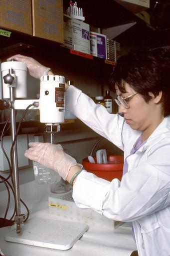 Keywords: Estrogen receptor assay (2).jpg An Asian female laboratory technician performing a step in the estrogen receptor assay test She is seen with a test tube containing some frozen breast tissue inserted in a beaker of ice water She is readying the tube for mixing The tube is being attached to the appropriate machinery The technician wearing rubber gloves and a white laboratory coat is not visible in all slides This test determines whether antiestrogen drugs or removal of ovaries is likely to be the effective therapy Topics/Categories People -- Adult People -- Health Professional Test or Procedure -- Lab Tests Type Color Photo Source National Cancer Institute Linda Bartlett Photographer 2035 1980 Reuse Restrictions None - This image is in the public domain and can be freely reused Please credit the source and/or author listed above Linda Bartlett Photographer PD-USGov-HHS-NIH Media from National Cancer Institute Visuals Online Images uploaded by Fæ Chemical tests |