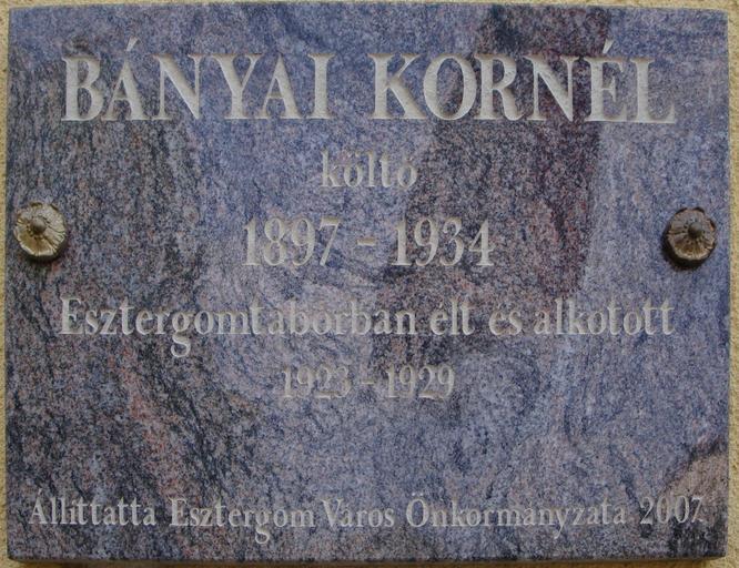 Keywords: Esztergom Bányai Kornél.jpg hu Bányai Kornél emléktáblája a Féja Géza Közösségi Ház falán Own Villy Plaques in Esztergom Plaques to poets in Hungary Here-lived plaques in Hungary Here-worked plaques in Hungary