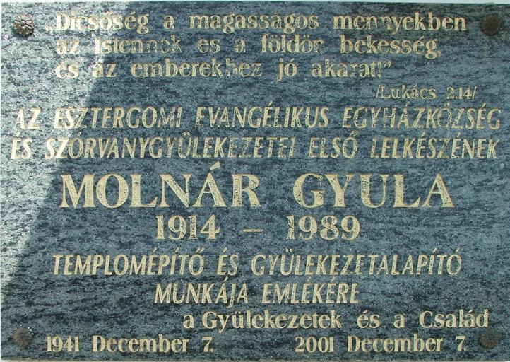 Keywords: Esztergom Molnár Gyula tábla.JPG hu Molnár Gyula emléktáblája evangélikus templom Own Villy date Plaques in Esztergom Plaques to priests in Hungary