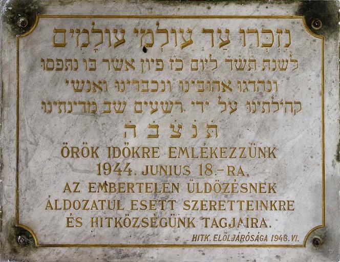 Keywords: Esztergom Zsidó temető emléktábla.jpg hu Emléktábla a zsidó temetőben Own Villy Plaques in Esztergom Jewish cemetery in Esztergom Holocaust memorials in Hungary Plaques in Hebrew Plaques in Hungarian Bilingual plaques in Hungary