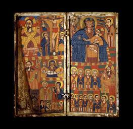 Keywords: Ethiopian - Right Diptych Panel with Virgin and Child Flanked by Archangels - Walters 363 - Open.jpg The paired holes along the outer edge of the right panel indicate that this painting was originally a triptych now missing its right panel What is seen here as a right wing is standard iconography for central panels combining a Virgin and Child based on the Santa Maria Maggiore icon with Christ Teaching the Apostles Although the Anastasis and the Crucifixion typically flank the central panel here they appear together on the left wing with other scenes The details in this wing stress the Virgin's participation in Christ's Passion thereby providing a moving counterpoint to the central panel where Mary appears with her infant son The density of the icon's pictorial program suggests that the missing panel also featured an extensive narrative Because the left wing ends with the Last Judgment it seems likely that the right wing opened with early scenes from the life of Christ such as the Nativity and concluded with Passion scenes that preceded the Crucifixion The painter's exuberant sense of color is characteristic of early Gondarine painting appearing in both icons and works on parchment The alternating horizontal and vertical bands of color connect this painting to works produced in the region of Lasta late 17th-early 18th century Early Gondarine tempera panel cm 52 1 51 9 ; Left panel cm 52 07 26 03 ; Right panel cm 52 07 25 87 accession number 36 3 4854 Knopfelmacher Collection New York date and mode of acquisition unknown Knopfelmacher 12 William Wright Gallery New York date and mode of acquistion unknown Walters Art Museum 1996 by purchase Museum purchase with funds provided by the W Alton Jones Foundation Acquisition Fund 1996 Angels of Light Ethiopian Art from the Walters Art Museum Birmingham Museum of Art Birmingham; Smith College Museum of Art Northampton; Museum of Biblical Art New York 2006-2007 Ethiopian Art at The Walters The Walters Art Gallery Baltimore 1996 Realms of Faith Medieval and Byzantine Art from the Walters Art Museum Frist Center for the Visual Arts Nashville 2001-2002 Realms of Faith Medieval and Byzantine Art from the Walters Art Museum Frist Center for the Visual Arts Nashville 2002-2005 place of origin Lasta in present-day Ethiopia Walters Art Museum license 3D Art of Ethiopia in the Walters Art Museum Church paintings in Ethiopia Paintings in the Walters Art Museum Media contributed by the Walters Art Museum needs category review Madonna and Child |