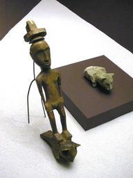 Keywords: Ethnologisches Museum Dahlem Berlin Mai 2006 020.jpg The statue with the man is a hook for windows from the island of Yap Item is from the Collection Zembsch 1884 The second piece is a head of cat made from sandstone also from Yap Item from the Collection Senfft 1902 Among anthropologists who visited the Micronesian islands of Yap in the beginning of the 20th century the plastic art of the islanders found little acknowledgement The German Wilhelm Müller for example who visited Yap in 1909 passed the judgement The artistic gift of the people of Yap is on a relatively low level Today we know that judging the aesthetics of non-European societies measured by western standards usually lead to the wrong conclusions It can be assumed that the objects tells us more about the extent of European influence on Yap than about the traditional Yapese art forms and meanings Cats were introduced by the Europeans to Yap at the end of the 19th century Possibly representations of the animals were made primarily for the sale to Europeans However the carved figure with one head in the shape of a cat and the other in the shape of a man was made for own purposes It is a hook which served to to keep open windows and doors of houses Both items are at the Ethnologisches Museum Berlin-Dahlem own 2006-05 Gryffindor I release it into the public domain Culture of Yap Figures in the Südseeabteilung Ethnological Museum Berlin sandstone sculptures Statues of cats in Germany |