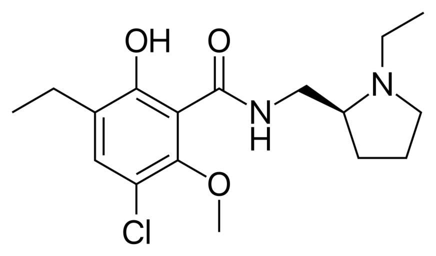 Keywords: Eticlopride.svg validSVG Skeletal formula of eticlopride Created using http //www acdlabs com/download/chemsk html ACD/ChemSketch 10 0 http //www inkscape org Inkscape and http //www vim org vim Own Fvasconcellos 2008-07-28 Benzamides Dopamine antagonists Phenol ethers Azolidines Anisoles Monochlorobenzenes Ethyl compounds N-substituted primary amides |