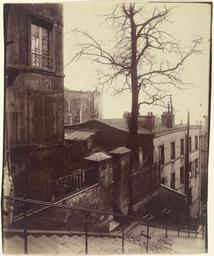 Keywords: Eugène Atget, Staircase, Montmartre - Getty Museum.jpg Artwork en Historians have suggested that the solitary tree served as a kind of self-portrait in Eugène Atget's photographs Trees were a favorite subject of the reclusive and private photographer and they appear often as silent witnesses in his views of Paris and its environs In a busy architecture study such as this one the lone winter-bare tree dominates the composition its branches drawn carefully on the blank slate of sky The old neighborhood's bleak textures of mildew decaying wood and plaster and scarred stone fill three-quarters of the frame while the few signs of nature such as the tree and the modest garden of the house at the left hold forth a promise of seasonal renewal 1924 Albumen silver print Image 21 8 x 17 8 cm 8 9/16 x 7 in Institution Getty Museum object history exhibition history other versions 71233 Inscription Inscribed verso print in pencil title and negative number 6258 Secondary Inscription Inscribed verso print in pencil in unknown later hand dealer's inventory number credit line accession number 90 XM 124 1 PD-old-auto 1927 1924 in Paris 1924 photographs Photographs of Paris by Eugène Atget Photographs in the Getty Museum Stairs in Montmartre |