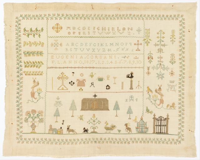 | Keywords: Eugenia Corsani - Sampler - Google Art Project.jpg  1810 1850 Eugenia 6857156 Corsani 1810 - 1850 /collection/cooper-hewitt-national-design-museum/artwork/sampler-eugenia-corsani/6854048/ 176700 Eugenia Corsani /artist/eugenia-corsani/29107200/ 29107200 /collection/cooper-hewitt-national-design-museum/ Cooper-Hewitt National Design Museum 3644669 http //www cooperhewitt org/ /collection/cooper-hewitt-national-design-museum/artwork/sampler-eugenia-corsani/6854048/ 1827 1827 Medium silk embroidery on linen foundationTechnique embroidered in cross and satin stitches on plain weave foundation 540 6854048 False 1827 1981-28-12 http //collection cooperhewitt org/view/objects/asitem/id/176700 Bequest of Gertrude M Oppenheimer Sampler 1820 1830 w670 x h540 cm 1827 False 1 24878048780488 Object sampler-eugenia-corsani Sampler s 670 H x W 54 x 67 cm 21 1/4 x 26 3/8 in Medium silk embroidery on linen foundationTechnique embroidered in cross and satin stitches on plain weave foundation special url_id kgFpyoyZI4BvEQ PD-old-100-1923 1850 Google Art Project works by Eugenia Corsani Textiles in the Cooper “Hewitt Smithsonian Design Museum 1820s samplers Google Art Project works in Cooper-Hewitt Smithsonian Design Museum 1827 works |