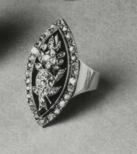 Keywords: European - Marquise Ring with Floral Decor - Walters 571760 - Three Quarter.jpg A marquise bezel with tied floral spray over foiled enamel ground set with diamonds century 18 gold enamel diamond silver cm 2 5 accession number 57 1760 15614 Henry Walters Baltimore date and mode of acquisition unknown Laura F Delano New York date of acquisition unknown by gift Walters Art Museum Gift of Laura F Delano 1946 Jewelry - Ancient to Modern The Walters Art Gallery Baltimore 1979-1980 place of origin Europe Walters Art Museum license Jewellery in the Walters Art Museum Art from Europe Media contributed by the Walters Art Museum needs category review |