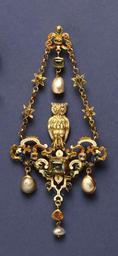 | Keywords: European - Owl Pendant - Walters 44481.jpg This pendant was formerly thought to be from the 16th century because of its late Renaissance-style enameled gold strapwork baroque pearls and the square-cut gems in box settings century 19 gold enamel tourmaline ruby diamond pearl cm 11 accession number 44 481 32150 Henry Walters Baltimore date and mode of acquisition unknown Walters Art Gallery 1931 by bequest Acquired by Henry Walters World of Wonder The Walters Art Gallery Baltimore 1971-1972 Jewelry - Ancient to Modern The Walters Art Gallery Baltimore 1979-1980 Objects of Adornment Five Thousand Years of Jewelry from the Walters Art Gallery Baltimore Cooper-Hewitt National Design Museum New York; Chrysler Museum of Art Norfolk; Carnegie Museum of Art Pittsburgh; San Antonio Museum of Art San Antonio; Philbrook Museum of Art Tulsa; Honolulu Academy of Arts Honolulu; New Orleans Museum of Art New Orleans; Milwaukee Art Museum Milwaukee; Minneapolis Institute of Arts Minneapolis; Toledo Museum of Art Toledo; The John and Mable Ringling Museum of Art Sarasota 1984-1987 Jewelry from the Walters Art Museum and the Zucker Family Collection The Walters Art Gallery Baltimore 1987 place of origin west Europe Walters Art Museum license Jewellery in the Walters Art Museum Art from Europe Media contributed by the Walters Art Museum needs artist update 19th-century jewellery Owls in art |