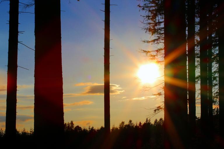 Keywords: evening sun sun sunset mood abendstimmung clouds sky setting sun evening sky forest trees tree trunks firs fir forest sunbeam