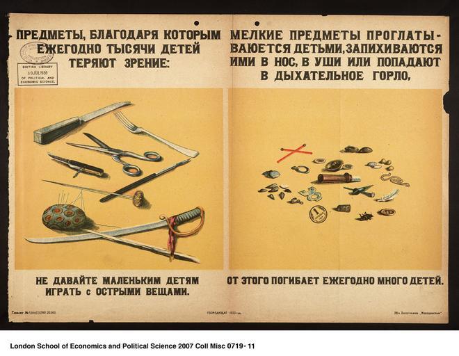 Keywords: lse library lselibrary sharps safety 1930 russian poster Two panels side by side illustrate some dangerous items which can injure children. The first panel, "Don't let small children play with sharp objects!" shows a sword, pins, a knife, fork, scissors, etc. The second, "Many children die each year from these", shows seeds, buttons, matchstocks, feathers, etc. Printer: Mospoligraf Publisher: Gosmedizdat Place of Production: Moscow Date: 1930 Persistent URL: archives.lse.ac.uk/dserve.exe?dsqServer=lib-4.lse.ac.uk&a... misc 0719/11') Two panels side by side illustrate some dangerous items which can injure children. The first panel, "Don't let small children play with sharp objects!" shows a sword, pins, a knife, fork, scissors, etc. The second, "Many children die each year from these", shows seeds, buttons, matchstocks, feathers, etc. Printer: Mospoligraf Publisher: Gosmedizdat Place of Production: Moscow Date: 1930 Persistent URL: archives.lse.ac.uk/dserve.exe?dsqServer=lib-4.lse.ac.uk&a... misc 0719/11') |