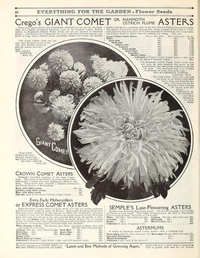 | Keywords: Everything for the garden (16204699259).jpg 80 <br> EVE5RYTHHHQ FOR THE QA1RID EM - Flower Seeds <br> Crego's GIANT COMET <br> OK MAMMOTH <br> OSTRICH PLUME <br> ASTERS <br> These truly grand Asters win enthusiastic admiration from all who see them <br> They are a highly developed American type of the German Comet Hohen- <br> zollern or Mammoth Ostrich Plume Asters and are far superior to imported <br> strains The flowers are of immense size 4 to 5 and often 6 inches across com- <br> posed of long wavy twisted petals gracefully formed into loose yet densely <br> The Giant Comets from you last <br> year were the finest Asters I ever <br> saw; they bloomed profusely <br> and the flowers were very <br> large <br> Miss EMMA <br> HARPER <br> Reno Pa <br> double half -globes equalling some of the finer Ostrich Plume Chrysanthemums <br> The plants of luxuriant branching growth attain a height of 18 inches to 2 feet <br> each plant bearing from 20 to 30 of these magnificent flowers on very long stems <br> which gives them an added value for cutting and vasing See cut <br> Crego's Giant Comet Asters Price 'Per Pkt ; Per 1 000 seeds; Per oz <br> White <br> Rose-pink <br> Shell-pink <br> Salmon-rose <br> Crimson <br> Violet-purple <br> Azure-blue <br> Lavender <br> Mixed Colors <br> 10c <br> 10c <br> 10c <br> 10c <br> 10c <br> 10c <br> 10c <br> 10c <br> 10c <br> 60c <br> 60c <br> 60c <br> 60c <br> 60c <br> 60c <br> 60c <br> 60c <br> 50c <br> 2 00 <br> 2 00 <br> 2 00 <br> 2 00 <br> 2 00 <br> 2 00 <br> 2 00 <br> 2 00 <br> 1 75 <br> Collection of Crego's Giant Comet Asters 1 pkt each <br> of the above 8 separate colors 60c <br> The Mammoth Ostrich Plume Asters from your <br> seed were the most beautiful ever grown in our <br> neighborhood and were greatly admired by all who <br> saw them They measured from 5 to 6 inches <br> in diameter on stems 16 4 inches high <br> Miss KATHERINE FISHER <br> Unionville Mich <br> My Giant Comet Asters last year took <br> two prizes at our exhibit where there <br> was a large and beautiful dis- <br> play One prize was for my <br> Lavender Comet it being <br> the largest Aster dis- <br> played <br> CORNELIA M <br> BOARDMAN <br> 1335 River <br> Boulevard <br> St Paul <br> Minn <br> Your Giant <br> Comet A sters were <br> very fine surpassing <br> any Asters I ever had <br> RUSSEL SMITH <br> Crete III <br> Crown Comet Asters <br> Strikingly beautiful varieties of the large Comet <br> type The center of the flower is a crown of pure white <br> 6urrounded by Some rich color making an effective con- <br> trast These Asters were awarded a diploma of honor by <br> the French Society of Horticulture <br> Rose with white crown Pkt 10c <br> Carmine with white crown 10c <br> Blue with white crown 10c <br> One pkt each of the above 3 Crown Comet Asters 25c <br> Extra' Early Hohenzollern <br> or EXPRESS COMET ASTERS <br> Early-flowering Comet Asters of great merit not only for garden purposes <br> but of even more value for early cut flowers Extra-early flowering Asters have <br> heretofore been produced at the expense of either size doubleness substance <br> or length of stem but the Express Comets are nearly as good as later-flowering <br> sorts and come into bloom in the open ground with us by the middle of July <br> They are the largest early Asters of which we know flowers 314 to 4 inches <br> across of double Comet type; splendid substance and long stems; plants healthy <br> and sturdy of branching habit; 18 inches high; free bloomers <br> White Passing to Rose The flowers open white changing to blush then pink <br> and finally to rose color Pkt 10c ;Per l 000seeds 60c <br> Crimson Pkt 10c; Per 1 000 seeds 60c Dark Blue 10c; 60c <br> Silver-lilac 10c; 60c Azure-blue 10c; 60c <br> Pure White 10c ; 60c Rose-pink 10c; 60c <br> Purple-violet 10c ; 60c <br> Mixed Express Comet 10c; 60c <br> Collection of Express Comet Asters 1 pkt each of 6 separate colors 50c <br> SEMPLE'S Late-Flowering ASTERS <br> Superior late-flowering Branching Asters The flowers are large very double <br> and borne on long stems They begin blooming about the first of September <br> Plants strong growers 18 inches to 2 feet high <br> White Pkt 10c; Per 1 000 seeds 60c Crimson Pkt 10c; Per 1 000 seeds 50c <br> Lavender 10c; 50c Shell-pink 10c; 50c <br> Purple 10c; 50c Mixed Colors 10c; 50c <br> Collection of above 5 separate sorts 40c <br> ASTERMUMS <br> A strain of American raised Comet Asters with a fetching title <br> Snow-white Pkt 15c \Perl 000 seeds 75c Rose-pink Pkt 15c \Perl 000 seeds 75c <br> Lavender Astermums 15c; 75c <br> Mixed Astermums 15c; 75c <br> Collection 1 pkt each of the above 3 40c <br> To every purchaser of ASTER SEED we \ arc c r anr l Rocr M rhnrlc r f firovA/inn Act rc whic <br> will send FREE if requested our leaflet LaieSl and DeSl / letnOCJS Of OrOWing /ASterS both <br> which tells how to grow them to perfection <br> in garden beds and for cut flowers 43874872 149634 78295 Page 80 Text http //www biodiversitylibrary org/page/43874872 c1915 10 5962/bhl title 78295 Henry G Gilbert Nursery and Seed Trade Catalog Collection ; Peter Henderson Co Biodiversity Heritage Library Everything for the garden 1915 Garden Stories Books Bulbs Plants Catalogs Equipment and supplies Flowers Gardening Lawn mowers Seeds U S Department of Agriculture National Agricultural Library bhl page 43874872 dc identifier http //biodiversitylibrary org/page/43874872 bhlGardenStories BHLinbloom bulbs plants u s department of agriculture national agricultural library bhlgardenstories bhlinbloom Information field Flickr posted date ISOdate 2015-01-28 Check categories 2015 August 25 CC-BY-2 0 BioDivLibrary https //flickr com/photos/61021753 N02/16204699259 2015-08-25 02 54 07 cc-by-2 0 PD-old-70-1923 Everything for the garden 1915 Photos uploaded from Flickr by FĂŚ using a script |