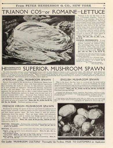 Keywords: Everything for the garden (16204946707).jpg 39 <br> WT mm PETEM HEHDEIRSQM OX CO» 9 MEW YOJRSi <br> – iiiiiiiiiiiiiiiiiiiiiiiiiiiiiiiiiiiiiiiiiiiiiiiiinw <br> TRIANON COS-or ROMAINE-LETTUCE <br> Trianon is by far the best of the <br> Cos or Romaine varieties These are <br> becoming very popular; they have a <br> distinct and pleasing flavor The long <br> spoon-shaped leaves form oval-shaped <br> heads and are easily blanched by gath- <br> ering the outer leaves at the top and <br> loosely tying them with soft string sev- <br> eral days before wanted for the table <br> Cos Lettuce may be used to advan- <br> tage where the heading varieties do not <br> succeed as almost the entire plant is <br> tender and palatable See cut <br> Price 10c pkt 20c oz 60c \i lb <br> 1 75 lb <br> EXPRESS HENDERSON'S A very <br> early Cos Lettuce of dwarf compact <br> growth heading up without tying <br> The self-folding inner leaves blanch <br> beautifully white crisp and tender <br> It stands hot weather splendidly and <br> is slow in bolting to seed Price 10c <br> pkt 20c oz 60c M lb 1 75 lb <br> / had fine luck with your Trianon Cos Let- <br> tuce in spite of the bad weather; many weighed <br> 2 pounds; solid white 1 ' <br> J DA VID R D No 3 Winsted Conn <br> I take this opportunity of praising the new <br> Trianon Cos Lettuce It is superb one is <br> enough for a large family <br> Dr J FITZ-MATHEW <br> West Sound Wash <br> H enderscws SUPERIOR MUSHROOM SPAWN <br> The white thread-like substance seen permeating the brick or tablet in which Mushroom Spawn is sold is called Mycelium The edible part of the Mushroom <br> is analogous to the flower in other plants The spawn as sold is in a dormant condition growth being suspended by withholding moisture The task for the <br> grower is to cause it to revive and resume growth This is accomplished by placing the spawn in prepared beds of fresh horse manure and soil which may be <br> made in a shed cellar or under greenhouse benches Next to proper preparation the most important thing is to maintain a uniform and moist air temperature <br> of 50 to 60 degrees Full directions given in pamphlet free if asked for <br> AMERICAN cuTF e MUSHROOM SPAWN <br> Recent discoveries in the production of Mushroom Spawn have <br> enabled us to offer cultures taken only from selected specimens <br> thus extending the work of selection to this delicious vegetable <br> It is now possible to reproduce Mushrooms showing superiority <br> in size color and shape The value of such selection is already <br> apparent for we are now able to offer a pure culture spawn that <br> will produce Mushrooms uniform in shape even in size and of a <br> constant creamy-white color American Pure Culture Spawn is <br> sold in flat bricks about V/2 inches thick weighing about a pound <br> One brick may be broken into nine pieces which set 12 inches apart <br> will spawn an area of 9 square feet Price 20c lb 10 lbs for 1 75 <br> 100 lbs for 14 00 Purchaser paying carriage <br> FRENCH VIRGIN MUSHROOM SPAWN <br> Produced by sowing the spores of the best specimens in a laboratory in <br> France under scientific conditions which provide immunity from disease <br> and thus insure greater vigor We have found it easy to produce <br> Mushrooms from this spawn They are large white and extremely <br> fleshy The spawn is sold in tablets four being required to spawn an <br> area of nine square feet Special directions for its use are enclosed <br> with every shipment Price 15c each 1 50 per doz 10 00 per 100 <br> Delivered in the U S <br> MARTYNIA Proboscidea Produces long seed-pods which gathered half grown <br> are green and tender Makes a delicious sweet pickle Price 10c pkt 30c oz <br> 1 00 14 lb 3 00 lb <br> MUSTARD The seed leaves are used for salad; when older they are boiled for greens <br> Chinese Large succulent leaves pleasantly pungent Price 5c pkt 10c oz <br> 25c M lb 75c lb <br> Giant Southern Curled A favorite in the South where it is sown in the fall for <br> spring salad Price 5c pkt 10c oz 25c J4 lb 75c lb <br> White London Generally used while young in salads and garnishing Price 5c <br> oz 15c M lb 40c lb <br> ENGLISH MUSHROOM SPAWN <br> This is the kind that has been in constant use for years and is <br> still preferred by many In order to insure its freshness we make <br> frequent importations and we can confidently recommend our stock <br> Use in same quantity as' 'American Pure Culture described adjoining <br> See cut below _ Price 15c lb 10 lbs for 1 25 100 lbs for 10 00 <br> Purchaser paying carriage <br> I bought some Mushroom Spawn American Pure Culture from you last year <br> and although my first attempt 1 had great success with it raising over two pounds <br> to afoot of space J R HALSTEAD 146 Welton Street <br> New Brunswick N J <br> I have grown a few Mushrooms in my cellar for several years and I want to say <br> that your Virgin Spawn produced the finest looking and best flavored crop 1 have <br> had CHARLES W BOWMAN Brownsville Pa <br> Our Leaflet MUSHROOM CULTURE Thoroughly Up To Date FKEE TO CUSTOMERS on Application 43874831 149634 78295 Page 39 Text http //www biodiversitylibrary org/page/43874831 c1915 10 5962/bhl title 78295 Henry G Gilbert Nursery and Seed Trade Catalog Collection ; Peter Henderson Co NameFound Martynia NameConfirmed Martynia L EOLID 61735 NameFound Proboscidea NameConfirmed Proboscidea EOLID 1643 NameBankID 4934169 Biodiversity Heritage Library Everything for the garden 1915 Garden Stories Books Bulbs Plants Catalogs Equipment and supplies Flowers Gardening Lawn mowers Seeds U S Department of Agriculture National Agricultural Library bhl page 43874831 dc identifier http //biodiversitylibrary org/page/43874831 bhlGardenStories BHLinbloom bulbs plants u s department of agriculture national agricultural library bhlgardenstories bhlinbloom Information field Flickr posted date ISOdate 2015-01-28 Check categories 2015 August 25 CC-BY-2 0 BioDivLibrary ht