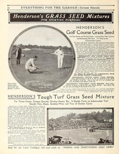 Keywords: Everything for the garden (16204993257).jpg of <br> the soil and notes on climate and the lay of the land should <br> be sent when ordering See cut <br> WE SHALL BE PLEASED TO CORRESPOND WITH <br> AND ADVISE GREENS COMMITTEES <br> HENDERSON'S PUTTING GREEN GRASS MIXTURE <br> Price delivered free in the U S 35c qt 1 25 for 4 qts 2 00 <br> pk 7 00 bu of 25 lbs Sow at the rate of 5 to 8 bushels per <br> acre according to the nature of the soil <br> HENDERSON'S FAIR GREEN GRASS MIXTURE Price deliv- <br> ered free in the U S per lb 30c per 100 lbs 25 00 Sow 100 to 150 <br> lbs per acre according to the nature of the soil <br> I have used your Putting Green Seed for the past three years and it has given the best <br> results of any seed I ever used I laid down two new Greens last year about the 15th of May <br> and July 1st they were playing on it S M CARPENTER Ml Vernon N H <br> Henderson's Tough Turf Grass Seed Mixture <br> For Tennis Courts Croquet Grounds Bowling Greens Etc It Quickly Forms an Indestructible Turf <br> Smooth Firm Elastic Standing Wear and Tear of Outdoor Games <br> Henderson's Tough Turf Grass Seed is a blend of <br> Grasses especially suited for the making of Grass Tennis <br> Courts Croquet Grounds Bowling Greens etc The <br> turf required for outdoor sports must be closely inter- <br> woven firm elastic smooth and durable to stand <br> the wear and tear These requirements are met in <br> Henderson's Tough Turf Mixture which is composed <br> of fibrous deep-rooting Grasses that spread and inter- <br> mingle The seeds are blended in the proper proportions <br> to form and maintain a tough matted sward constantly <br> green even in dry weather These varieties of Grasses <br> being low-growing and fine-leaved require to be sown <br> liberally if a playing turf is desired quickly; not less <br> than one quart should be used for 300 square feet or <br> five bushels per acre although fifty per cent more may <br> be used with advantage; half that quantity will do for <br> renovating See cut <br> Price delivered free in the U S 30c qt 1 00 for <br> 4 qts 1 75 pk 6 00 bu of 20 lbs <br> 1 purchased some 'Tough Turf Grass Seed Mixture <br> from you last year It succeeded admirably and is very <br> beautiful keeping green all the year round <br> HART F SMITH Isleton Cal <br> You will perhaps be pleased to know that our tennis <br> court made last year by sowing your 'Tough Turf Grass <br> Seed was a great success We commenced mowing it in <br> about 5 weeks and were playing on it in 6 weeks' lime <br> without any apparent injury as the Grass kept thickening <br> up all the time and it is a beautiful bit of turf We are <br> delighted <br> Miss LOUISE MACDOWELL Lenox Mass <br> Send for our Lawn Catalogue and read article on MAKING AND MAINTAINING GOLF LINKS 43874858 149634 78295 Page 66 Text http //www biodiversitylibrary org/page/43874858 c1915 10 5962/bhl title 78295 Henry G Gilbert Nursery and Seed Trade Catalog Collection ; Peter Henderson Co Biodiversity Heritage Library Everything for the garden 1915 Garden Stories Books Bulbs Plants Catalogs Equipment and supplies Flowers Gardening Lawn mowers Seeds U S Department of Agriculture National Agricultural Library bhl page 43874858 dc identifier http //biodiversitylibrary org/page/43874858 bhlGardenStories BHLinbloom bulbs plants u s department of agriculture national agricultural library bhlgardenstories bhlinbloom Information field Flickr posted date ISOdate 2015-01-28 Check categories 2015 August 25 CC-BY-2 0 BioDivLibrary https //flickr com/photos/61021753 N02/16204993257 2015-08-25 02 51 07 cc-by-2 0 PD-old-70-1923 Everything for the garden 1915 Photos uploaded from Flickr by Fæ using a script |
