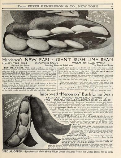 Keywords: Everything for the garden (16390806445).jpg Hendersons NEW EARLY GIANT BUSH LIMA BEAN <br> PLANTS TRUE BUSH ENORMOUS BEANS TENDER RICH and BUTTERY <br> No Poles No Stakes Equalling Those of Pole Limas The True Lima Taste <br> NEW EARLY GIANT With great confidence we urge our <br> customers to grow this Bean the acme of perfection in a type of <br> vegetable which we ourselves introduced many years ago It is <br> the best possible Bush Lima Bean possessing every quality so long <br> known and esteemed in the older pole varieties and can be grown <br> as easily as any Snap Bean It produces pods of enormous size <br> which are well-filled with large thick fleshy Beans of perfect quality <br> just as good in flavor just as tender and just as numerous as any <br> of the climbing varieties <br> The pods are long very broad and thick enough to keep the <br> Beans tender for a long period and are produced in enormous <br> quantities all through the growing season <br> It is the earliest of the large bush sorts and may therefore be had <br> on the table weeks ahead of the old pole varieties The strong <br> rugged plant produces so freely and continuously that a small <br> planting will ensure an abundant supply of the most delicious <br> Beans right up to frost See cut Price 15c pkt 2 pkts for <br> 25c 35c pt 60c qt 2 25 for 4 qts 4 00 pk <br> The house of Henderson was indeed fortunate in introducing the Early Giant <br> Bush Lima a variety of pre-eminent merit It is a robust grower a prolific ana <br> continuous bearer of large delicious Limas It is my prediction that Henderson's <br> Early Giant Bush Lima has a bright future <br> W E VAIL Yorktown Heights N Y <br> Your Bush Lima Beans ” 'Early Giant ” were excellent fully equal to Pole <br> Limas and so much earlier Two rows 30 feet long gave us all we could use from <br> July until frost and we gathered liberally They were so delicious <br> Mrs CHARLES MORTON Chamber sburg Pa <br> I must say the Early Giant are the best Bush Limas I ever grew for size bearing <br> and flavor The plants hung full all summer and fall <br> G L JOHNSON Springfield Mass <br> Improved Henderson Bush Lima Bean <br> YIELDS CONTINUOUSLY FROM EARLY SUMMER TO <br> FROST-SUITABLE FOR ALL SECTIONS NORTH and SOUTH <br> The original Bush Lima Bean the Henderson was defective in size and though <br> because of its extreme earliness thousands of our customers were enabled to grow <br> Lima Beans where none had grown before the defect remained until the introduc- <br> tion of the Improved Henderson which is at least 50 per cent larger than the <br> original Though a day or two later it is still 10 days earlier than other bush <br> forms and weeks earlier than any of the pole varieties yet retaining all the <br> remarkable qualities of its predecessor which was without doubt the most <br> remarkable vegetable novelty of the last century <br> Ilk The Improved Henderson is a perfect all-around variety it grows as <br> Hk freely and is just as dependable in the North as in the South in fact <br> it is the only one suitable for all sections The quality is excellent <br> ssessing the rich buttery flavor common to all Limas See <br> cut Price 15c pkt 25c pt 40c qt 1 50 for 4 qts <br> T 2 50 pk <br> WB FORDHOOK BUSH LIMA The largest bush form of the <br> I popular Potato Lima The plants often grow 20 inches <br> By in height of true bush form; pods 4 to 5 inches long con- <br> Hf tain 3 to 5 large delicious Limas nearly as large again as <br> the original type It is 4 to 6 days earlier bearing freely <br> throughout the season Price 15c pkt 30c pt 55c qt <br> 2 10 for 4 qts 4 00 pk <br> HENDERSON BUSH LIMA The original ” about 3 days earli- <br> er than the Improved ” but pods and Beans are smaller Price 10c pkt <br> 20c pt 35c qt 1 25 for 4 qts 2 00 pk <br> BURPEE'S BUSH LIMA A bush form of the large white Lima growing <br> about 20 inches high Its large size commends it to many Price 10c <br> pkt 20c pt 35c qt 1 25 for 4 qts 2 25 pk <br> DREER'S BUSH LIMA A bush form of Dreer's Pole Lima Beans thick <br> sweet and succulent growing close together in the pods Plant vigorous about 18 inches <br> high with abundant foliage Grows well even in dry seasons Price 10c pkt 30c pt 50c <br> qt 1 85 for 4 qts 3 50 pk <br> SPECIAL OFFERv ” 1 packet each of the above 6 Bush Limas delivered free in the United States for 60 cents 43874807 149634 78295 Page 15 Text http //www biodiversitylibrary org/page/43874807 c1915 10 5962/bhl title 78295 Henry G Gilbert Nursery and Seed Trade Catalog Collection ; Peter Henderson Co NameFound Limas NameConfirmed Limas NameBankID 4220815 Biodiversity Heritage Library Everything for the garden 1915 Garden Stories Books Bulbs Plants Catalogs Equipment and supplies Flowers Gardening Lawn mowers Seeds U S Department of Agriculture National Agricultural Library bhl page 43874807 dc identifier http //biodiversitylibrary org/page/43874807 bhlGardenStories BHLinbloom bulbs plants u s department of agriculture national agricultural library bhlgardenstories bhlinbloom Information field Flickr posted date ISOdate 2015-01-28 Check categories 2015 August 25 CC-BY-2 0 BioDivLibrary https //flickr com/photos/61021753 N02/16390806445 2015-08-25 03 01 51 cc-by-2 0 PD-old-70-1923 Everything for the garden 1915 Photos uploaded from Flickr by FĂŚ using a script