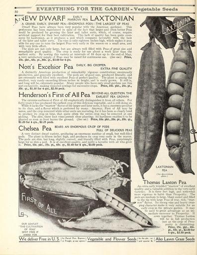| Keywords: Everything for the garden (16390865595).jpg <br> above <br> Thomas Laxton Pea <br> An extra early wrinkled marrow of excellent <br> quality and a valuable addition to the very early <br> varieties It is three feet high and somewhat <br> more vigorous in habit than Prosperity The <br> pods are medium to large blunt ended and filled <br> to the tip with large Peas of true rich mar- <br> -~3 row flavor Its strong vine and heavy crop- <br> g character make it very suitable for an <br> arly crop in the private garden It may <br> be used to great advantage as an im- <br> mediate successor to Prosperity If <br> sown together Thomas Laxton <br> will be in full production <br> just as the crop of Pros- <br> perity is diminishing <br> Price 15c pkt 30c <br> s pt 55c qt 2 00 for <br> 4 qts 3 50 peck <br> We deliver Free in U S j by P Par ' Post - Express J Vegetable and Flower Seeds j by he pkt ~ ~ Also Lawn Grass Seeds <br> __ ___-_-___ __ _ or Freight at our option and quarter lb I 43874842 149634 78295 Page 50 Text http //www biodiversitylibrary org/page/43874842 c1915 10 5962/bhl title 78295 Henry G Gilbert Nursery and Seed Trade Catalog Collection ; Peter Henderson Co Biodiversity Heritage Library Everything for the garden 1915 Garden Stories Books Bulbs Plants Catalogs Equipment and supplies Flowers Gardening Lawn mowers Seeds U S Department of Agriculture National Agricultural Library bhl page 43874842 dc identifier http //biodiversitylibrary org/page/43874842 bhlGardenStories BHLinbloom bulbs plants u s department of agriculture national agricultural library bhlgardenstories bhlinbloom Information field Flickr posted date ISOdate 2015-01-28 Check categories 2015 August 25 CC-BY-2 0 BioDivLibrary https //flickr com/photos/61021753 N02/16390865595 2015-08-25 03 02 48 cc-by-2 0 PD-old-70-1923 Everything for the garden 1915 Photos uploaded from Flickr by Fæ using a script |
