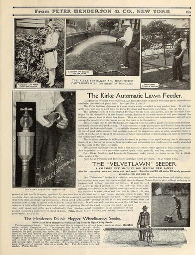 Keywords: Everything for the garden (16391145225).jpg Fr sm PETER HEMDEMOM <br> O MEW YOIRH <br> The Kirke Automatic Lawn Feeder <br> It applies the fertilizer while watering and feeds the grass or garden with high grade immediately <br> available concentrated plant food See cuts- Nos 1 and 2 <br> The Kirke fertilizer dispenser is a neat device easily attached to any garden hose It will last <br> a life time and can be used both for Kirke Fertilizer and Insecticide cartridges See cut No 4 <br> The cartridge stick of Concentrated Fertilizer for the lawn and garden and the Nicotine Cart- <br> ridges for the destruction of soft bodied insects dissolve in as much water as will pass through the <br> ordinary garden hose in about five hours They are clean odorless and nonpoisonous and will give <br> perceptible results after one weeks use on the lawn or in the garden <br> The cartridges that fit into the feeder are prepared from the highest grade of concentrated fertilizer <br> absolutely soluble and quick acting A combination to make plants grow and flourish keep the grass <br> green and the flowers in bloom Its available elements of plant food in one tablet are equal to at least <br> SO lbs of good stable manure but contains none of the impurities such as odor unsightly refuse or- <br> seeds of weeds not to speak of the amount of labor required first in distributing and later in removing; <br> the undissolved refuse <br> The fertilizer cartridge is sufficiently hardened to prevent a too rapid wasting but is thoroughly <br> dissolved as it leaves the nozzle or lawn sprinkler and is therefore in a condition to be readily absorbed <br> by the roots of the plants or grass ' <br> The nicotine cartridge is made from a free nicotine which when applied to both indoor and out <br> door vegetation acts as a preventive against aphis thrip green fly rose bug mealy bug etc <br> Price Kirke Fertilizer and Insecticide Dispenser nickel plated as shown in cut No 4 3 00 <br> Mail weight 2 lbs- <br> Price Kirke Fertilizer and Insecticide cartridges S3 00 per dozen Mail weight 8 lbs <br> THE VELVETLAWN SEEDEFv <br> A VALUABLE NEW MACHINE FOR SEEDING NEW LAWNS <br> Also for renovating worn out lawns and bad spots Puts the seed IN old sod or IN newly prepared <br> ground covers and rolls it <br> The Velvetlawn Seeder is a valuable new machine for seeding new lawns and doubly valua- <br> ble for renovating worn out lawns and bad spots in Greens Tennis Courts etc without redigging or <br> plowing and without marring the surface It puts the seed <br> IN newly prepared ground or IN old sod the seed is dis- <br> tributed very evenly in any desired quantity wind or no wind <br> not too thick in some places and too thin in others In new <br> ground or soft turf it is easily operated by one man but in old hard sod it may require another person to pull The <br> revolving discs cut narrow trenches the seed being sown in it and immediately behind the discs There are eight of these <br> discs with their accompanying seed spouts These sow 2 inches apart putting the seed in at any desired depth thus the <br> machine sows a strip 16 inches wide as fast as a man can walk It will sow and cross sow an area 50 x 150 feet in thirty <br> minutes a little roller follows each seed spout thus pressing the soil back and covering the seed As each <br> disc seed spout and roller work individually they therefore adapt themselves to the inequalities of the <br> ground insuring a perfectly even stand of grass Price Hand Power Velvet Lawn Seeder complete with <br> press wheels net 15 00 <br> The Henderson Double Hopper Wheelbarrow Seeder <br> Sows Grass Seed Mixtures as well as Heavy Seeds or Light Chaffy Seeds <br> This is a superior Seeder One side of the Seed Box is adapted for all such heavy seeds as clover timothy; <br> millet alfalfa Hungarian etc The opposite side handles the light chaffy <br> seeds as Red top Kentucky blue Orchard grass etc as well as grass seed <br> mixtures for golf pasture hay lawns etc The machine may be easily regu- <br> lated to sow any desired quantity per acre sowing it accurately and evenly <br> the whole length of the hopper 14 feet and it does not clog up The total <br> weight of thj machine is only 40 pounds The hopper is perfectly balanced <br> and is close to the large wheel giving greatest force with least exertion <br> and leaving light weight on the operator Every machine warranted to do <br> good work and of especial value on a windy day Full directions with each <br> seeder Price 110 00 <br> THE KIRKE FERTILIZER DISTRIBUTOR 43874977 149634 78295 Page 185 Text http //www biodiversitylibrary org/page/43874977 c1915 10 5962/bhl title 78295 Henry G Gilbert Nursery and Seed Trade Catalog Collection ; Peter Henderson Co Biodiversity Heritage Library Everything for the garden 1915 Garden Stories Books Bulbs Plants Catalogs Equipment and supplies Flowers Gardening Lawn mowers Seeds U S Department of Agriculture National Agricultural Library bhl page 43874977 dc identifier http //biodiversitylibrary org/page/43874977 bhlGardenStories BHLinbloom bulbs plants u s department of agriculture national agricultural library bhlgardenstories bhlinbloom Information field Flickr posted date ISOdate 2015-01-28 Check categories 2015 August 25 CC-BY-2 0 BioDivLibrary https //flickr com/photos/61021753 N02/16391145225 2015-08-25 01 53 55 cc-by-2 0 PD-old-70-1923 Everything for the garden 1915 Photos uploaded from Flickr by FĂŚ using a script |