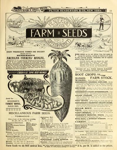 Keywords: Everything for the garden (16646822827).jpg of varieties see page 3o <br> Improved Iiong- Orangre 60c per lb <br> Yellow Belg'ian 40c <br> White Belg'ian 40c <br> Danvers Half-long 70c <br> Our Pamphlet ROOT CROPS FOR FARM STOCK free to <br> Customers asking for it <br> It tells how to grow winter and feed roots <br> Vetch Spring Vicia Sativa Generally sown In <br> mixture with oats for feeding green to cattle 10c lb <br> L' T5 bush of 0 Ills <br> WIIiD RICE Zizania Aqttatica Much soughtafter <br> owing to its having attractions for water-fowl 20c <br> lb 100 lbs 10 00 <br> Farm Seeds we do NOT deliver free or' 'ma i Tt'lu7p ripay ' ' ' <br> prepay postage or <br> rr'age » c per 15 IS addcd to the prices 42383110 133997 66553 Page 69 Text http //www biodiversitylibrary org/page/42383110 1902 10 5962/bhl title 66553 Henry G Gilbert Nursery and Seed Trade Catalog Collection ; Peter Henderson Co NameFound Baga NameConfirmed Baga EOLID 8883453 NameBankID 4086457 NameFound Plax NameConfirmed Plax NameBankID 4301403 NameFound Urtica NameConfirmed Urtica EOLID 15515381 NameBankID 2645854 NameFound Zizania NameConfirmed Zizania EOLID 108104 NameBankID 2661372 Biodiversity Heritage Library Everything for the garden 1901 Garden Stories Catalogs Peter Henderson Co Plants Ornamental Seed industry and trade Seeds Trade catalogs Vegetables U S Department of Agriculture National Agricultural Library bhl page 42383110 dc identifier http //biodiversitylibrary org/page/42383110 bhlGardenStories Root Crops Garden Tools and Implements BHLinbloom peter henderson co plants ornamental u s department of agriculture national agricultural library bhlgardenstories root crops garden tools and implements bhlinbloom Information field Flickr posted date ISOdate 2015-03-18 Check categories 2015 August 24 CC-BY-2 0 BioDivLibrary https //flickr com/photos/61021753 N02/16646822827 2015-08-24 20 52 19 cc-by-2 0 PD-old-70-1923 Everything for the garden 1902 Photos uploaded from Flickr by Fæ using a script |