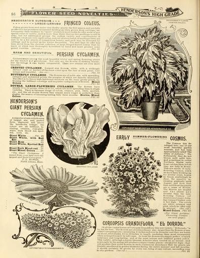 | Keywords: Everything for the garden (16666765820).jpg iflDEI SOJ 'S SUPERIOR - « - <br> ž M « « « M M LiflRGE-IiHflVED <br> FHlfiGED COIiEUS <br> HENDERSON'S LARGE- <br> LEAVED COLEUS <br> Coleus grown from seed make very thrifty plants the first season and are fully <br> as effective for promiscuous summer bedding as when grown from cuttings- un <br> fortunately their tendency to sport renders it inadvisable to offer seeds of an-v <br> special color or variety as it is more than likely that no two seedlings would be <br> alike but for subtropical groups the endless varietv and combinations of <br> brilliant colors are very captivating and out of every batch of seedlings there are <br> sure to be a few plants of conspicuous beauty and such mav be increased bv <br> cuttings and be potted up for winter decoration The seed that we offer has <br> been saved from the choicest collection of large fringed-leaved Coleus that we <br> know of which were thoroughly hybridized by hand and must produce some <br> grand varieties See cut pj f 25 <br> ni nm ND BEMUTiFuu_ p£ jsifl CVCIifllVIEI <br> Cyclamens are among the most beautiful winter and spring flowering plants <br> for the window and greenhouse Not only are the flowers of striking beauty <br> but the foliage m also highly ornamental These new strains are even more <br> beautiful <br> CBESTED CYCLAMEN Largest size flowerB white with a strikingly <br> distinct crest or feather of the same color upon the face of each petal verv <br> unique and beautiful See cut Pkt 50 <br> BUTTERFLY CYCLAMEN The flowers are of noble size with spreading <br> crimped and undulated petals the margins of which are daintily fimbriated <br> iheeffect IS to throw high lights and shadows on the waxv glossy petals en- <br> hvenlngthe brilliant colorings and exciuisite variegations of floweVs Mixed <br> Colors Pkt 50 <br> DOUBLE LABOE-PLOWEBING CYCLAMEN The flowers have <br> usually 8 to 10 letals often 12 to l j wliich are more spreading than in single <br> varieties There is the same range of colors crimson pink white spotted <br> etc and like all double flowers they remain much longer in perfection than <br> singles the season of blooming lasting fully three months Double Mixed <br> Colors Pkt 3- <br> HENDERSOI 'S <br> GIAJiT PEl SIflH <br> GVGIifl VIEIl <br> A superior strain with flowers <br> of largest size and perfect <br> form displayed well above <br> the handsome foliage; the <br> colors are all brilliant in- <br> cluding crimson rose-pink <br> white dark blood red spot- <br> ted eyed etc <br> Qiant White Pkt 25 <br> Oiant White with Bed <br> žEye 25 <br> G-iant Bose 2' <br> Oiant White Spotted Bed <br> 25 <br> Oiant Dark Blood-red 25 <br> Oiant Mixed Colors 20 <br> ¢ ¢The Giant Cj-clamens I <br> raised from your seed »ere the <br> largest and /inest I ever grew <br> T L HO WES <br> North Adams Mass <br> EflRliV <br> SUMlWER-FijQWEttiriG <br> GOSIVIOS <br> COP YRJGH TI90IB YPETeB HCNDERSOM SCO <br> The Cosmos has de- <br> veloped into one of our <br> most beautiful garden <br> annuals and has been <br> appropriately called The <br> Glory of Autumn Un- <br> fortunately they do not <br> blf om until quite late <br> and sometimes in colder <br> Northern States early <br> frost catches them before <br> the y are fully in flower <br> This new strain of early- <br> flowering Cosmos which <br> we have been working up <br> for several years begins <br> to bloom scatteringly in <br> June the quantity in- <br> creasing graduallj until <br> August and from that <br> time until frost the plants <br> are a mass of flowers <br> The flowers are smaller <br> and the plants are <br> dwarfer than the late- <br> flowering Cosmos of- <br> fered on next page torm- <br> ing compact bushes only <br> 4 feet high The colors <br> are white crimson and <br> pink which we offer only <br> in mixture See cut <br> Mixed Colors Pi« 10 <br> For Giant Autumn- <br> Flowering Cosmos <br> see next page <br> GOHEOPSIS GtJflNDlFIiOW Ell DOJjflDO <br> Of all the varied forms of Coreopsis Grandiflnra this new variety El Dorado is <br> by far the best The flowers are of extraordinary size ” largerthan the flowers of any <br> otherCoreopsisgrown ” measuring 3 inches and over in diameter and they are borne <br> oiistout erect stalks 15 to 18 inches in length rendering them most ornamental <br> when arranged loosely in tall vases In form the flowers are simply perfect of much <br> substance and long-lasting and of the most intense and brilliant golden yellow <br> This variety although a hardy biennial is better when treated as an annual ; seed <br> sown early in the spring will produce compact bushy plants ” about 2 feet high ” that <br> will produce their noble flowers in such continuous abundance that the plants are <br> literally smothered in golden blo-ssoms during the entire summer and fall months- <br> it should certainly be grown by every one being of easy culture succeeding even <br> In city gardens Seecut pj t 25 <br> ¢ ¢ fSTisiSs 42383175 133997 66553 Page 86 Text http //www biodiversitylibrary org/page/42383175 1902 10 5962/bhl title 66553 Henry G Gilbert Nursery and Seed Trade Catalog Collection ; Peter Henderson Co NameFound Coreopsis NameConfirmed Coreopsis L EOLID 38349 Biodiversity Heritage Library Everything for the garden 1901 Garden Stories Catalogs Flowers Peter Henderson Co Plants Ornamental Seed industry and trade Seeds Trade catalogs U S Department of Agriculture National Agricultural Library bhl page 42383175 dc identifier http //biodiversitylibrary org/page/42383175 bhlGardenStories Coleus Coreopsis Cosmos Cyclamen BHLinbloom peter henderson co plants ornamental u s department of agriculture national agricultural library bhlgardenstories bhlinbloom Information field Flickr posted date ISOdate 2015-03-18 Check categories 2015 August 24 CC-BY-2 0 BioDivLibrary https //flickr com/photos/61021753 N02/16666765820 2015-08-24 20 57 46 cc-by-2 0 PD-old-70-1923 Unident