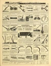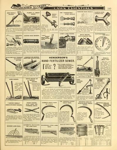 Keywords: Everything for the garden (16666942630).jpg TABLISH M <br> 189 <br> CEM NOZZLE <br> HOLDER <br> Forwatering lawns flower <br> beds etc The hose is held <br> firmly and can be adjusted <br> to any elevation <br> PLANET Jr CRASS <br> EDCER <br> A good machine for the <br> rapid and easy edging of turf <br> bordei-s and cleaning of <br> walksand drives It will edge <br> and clean about one mile Sin <br> hour Price 6 00 <br> BRASS <br> HOSE <br> NOZZLE <br> With stop <br> cock spray <br> rose and <br> stream <br> Prices for and 5i-in <br> hose 7oc for 1 in 90c ; post- <br> age 10c extra <br> THE GRADUATING <br> SPRAY NOZZLE <br> Will throw a coarse or a <br> fine spray or a solid stream <br> Price in 50c ; 1 in 60c ; <br> postage extra 5c <br> PARAGON HOSE NOZZLE <br> It throws either a stream <br> or a flat fan-shaped sheet <br> spray as desired ; splendid for <br> watering lawns and flower <br> beds For -in hose 60c ; <br> postage 5c each extra <br> SIAMESE HOSE <br> CONNECTION <br> With these a <br> lawn sprinkler <br> can be attached <br> to every leng-th of hose so <br> several sprinklers can be <br> operating atonetime Price <br> for i-in hose 60c ;l-in ho» e <br> Toe ; postage extra 10c each <br> PracticaJ simple perfect <br> Box of 6 tubes 20 bands and <br> pliers T5c ; or by mail 3100 <br> Give size of hose <br> Tubes in 3c ; 1 in 4c ea <br> Bands siOc perdoz <br> Pliers 30c ; by mail 35c <br> COOPER HOSE MENDER <br> Brass ; will not rust or wear <br> scarcely decreases the flow <br> No fastening required ; barbs <br> hold hose firm Price for <br> hose with -in bore 7c each <br> 75c doz ; 1 in 8c each 85e <br> doz By mail add 6c per <br> doz <br> CRASS <br> TURF <br> KNIFE <br> For <br> arouni <br> Price <br> trimming tlir srid <br> d borders of walks etc <br> with handle 70c each <br> LYON'S LAWN FEEDER <br> device at- <br> t a c h i n g be- <br> tween hoseand <br> nozzle and <br> holding a stick <br> of Concentrat- <br> ed Fertilizer; the water pass- <br> iiv thruuyrh dissolves it in <br> about one hour Holder and <br> 12 cartridges prepaid SI 00 <br> 24 extra cartridges 50c ; or <br> prepaid 75c <br> BRASS BROOM <br> WITH SCRAPER HOE <br> OLD-FASHIONED <br> SUN DIALS <br> m <br> II K/ <br> T «gS <br> <br> For lawns and -nalk <br> can be used to push <br> sweep chip or dig <br> s It <br> pull <br> 12 in <br> It <br> 18 <br> 18 <br> i rows <br> 5 <br> 5 <br> 5 <br> of bristles <br> 0 75 <br> 90 <br> 3 00 <br> 1 15 <br> Very unique and interest- <br> ing lawn ornaments Price <br> 81 M each <br> REVOLVING SOD TRIMMER <br> OR BORDER <br> CUTTER <br> COMBINATION BORDER <br> KNIFE AND SCUFFLE HOE <br> HENDERSON'S <br> HAND FERTILIZER SOWER <br> S YOUR <br> Lawn Poor <br> Worn Out <br> and full off <br> Bad Spots <br> Then It needs fertilizer ” <br> which can be broadcasted <br> on evenly and at any <br> time of the year with our <br> Hand Fertilizer Sower <br> For trimming turf around <br> edges of walks and beds A <br> revolving knife enables the <br> work to be done with rapid- <br> ity Price 1 25 <br> For edging up borders and <br> cleaning walks ; instantly <br> changed from edgertoscuffle <br> hoe Price 7J -in blade 7oc <br> each; 9-in blade 90c each <br> LAWN SHEARS <br> For cutting <br> grass under <br> shrubs <br> fences etc <br> Price with <br> two wheels <br> 9-inch <br> blades 3 00 <br> CRASS EDGING OR <br> BORDER <br> SHEARS <br> Fortrimmingover- <br> hanging grass <br> around edges <br> of walks etc <br> Price 9-inch <br> blades 82 50 <br> or with <br> wheel 2 85 <br> HENDERSON'S HAND FERTILIZER SOWER <br> Sows all kinds of commercial fertilizers wood <br> ashes lime etc in large or very small quantities <br> for topdreHsing lawns etc It can be used for ferti- <br> lizing strawberry beds and gardens ; excellent for <br> sifting ashes sawdust or sand on icy walk <br> The hopper is S4 inches long and holds one and <br> a half bushels Weight of machine 88 pounds It <br> is well made and nicely painted Price 12 00 <br> An imported turfing iron <br> forliftingsod evenly rapidly <br> and without breaking §5 00 <br> Turf Cutting Axe 2 25 <br> REDDICK <br> MOLE TRAP <br> The best trap <br> invented easy to <br> set cannot in- <br> jure domestic <br> animals VVili <br> ca t ch moles <br> quite deep in the <br> ground No pin <br> or obstruction <br> protrudes in the <br> run to fright- <br> en them Price <br> SI 25 each 3 for <br> §3 50 13 00 doz <br> HENDERSON'S <br> LIFTING <br> WEEDER <br> A chisel blade <br> cuts off the weeds; <br> the trigger <br> holds themso <br> they can be <br> pulled out <br> 60c each <br> ' ' Price 50c ea <br> A convenient tool for cut- <br> ting weeds out of lawns with- <br> out marring the surface <br> Price 50c each <br> CURVED HANDLE <br> CRASS OR SHEEP SHEARS <br> HEDCE SHEARS <br> ALSO USED FOR <br> TRIMMING CRASS <br> Extra long 7-inch blades <br> The handles are curved to <br> prevent nibbing the knuck- <br> les on the ground Price <br> 1 00 <br> 8-in blades SI 25 with notch <br> 81 50; 9-in blades 81-50 with <br> notch Sl 5; 10-in blades <br> S1 75 with notch 2 00 <br> The notch is at the heel <br> of the blades for cutting <br> small branches <br> COMMON CRASS HOOK <br> OR SICKLE <br> A good American <br> hook that we offer <br> to meet a demand <br> for a low price hook <br> Medium size 25c ; <br> full size 30c <br> THE KNUCKLE SAVER-' <br> CRASS HOOK <br> The Raised Ilandle <br> enables the oper- <br> ator's hand to <br> clear the ground <br> at the same time <br> giving a square <br> cut Made from <br> Solid Steel ground <br> sharp Price No <br> 2 40c ; No 3 ioc i <br> No 1 We <br> IMPORTED ENCLISH <br> RIVETED-BACK CRASS <br> HOOKS <br> Thin sharp <br> blades strength- <br> ened by a riveted <br> back light and <br> rapidly nandled <br> Small 50c <br> Tedium o5c <br> Large 60c <br> IMPORTED ENCLISH <br> RIVETED- <br> back lawn <br> ythe <br> Light and <br> thin broad <br> blades <br> strengthened <br> by a riveted back <br> t