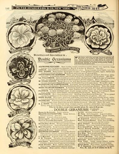 Keywords: Everything for the garden (16828390046).jpg PETER HENI ERSON 8 CO l\EW YORK <br> 1 <br> I <br> mm <br> k'-'j-f <br> ri-r2 <br> Sfe; b - <br> p 7i; r <br> IRovelties anO Specialties in <br> 2 ouble Bevaniums <br> y <br> ill <br> –  / ' <br> ' 'M <br> WE offer below and on the next page the finest collection of <br> Geraniums it is possible to get together at the present <br> time Going carefully over our fields during the season we <br> discarded everything that was not rst-class in every way pay- <br> ing particular attention to selecting strong-growing healthy <br> free-flowering and distinct sorts <br> ALPHONSE RICCARD Semi-double bright vermilion-scarlet; dwarf very vigorous large <br> trusses -4 to 71 inches in diameter ; florets 2 iiiciies in diameter See cut <br> C SAR Eed-solferino a brilliant and effective color Large trusses dwarf habit very free <br> COL BARRE Semi-double dwarf and very free ; lower petals rosy pink ; upper darker and <br> marked scarlet at the base Both floret and truss are of unusual size <br> COUNTESSE DE CASTRIES Clear pure deep pink bright and distinct ; fine truss splen- <br> did habit A splendid variety and should be in every collection ; sure to please See cut <br> LA FRAICHEUR Quite double pure snow-white distinct narrow Picotee edge of clear rosy <br> pink ; the effect is especially fresh and delightful; dwarf compact Price 35c each <br> M JULES DISPOT Largo flowers in very fine trusses rich violet-lake changing to crim- <br> son and shading to lilac at the centre violet and crimson in same truss Price 2 c each <br> MARQUISE DE CASTELLAINE A shapely dwarf grower with immense flowers about <br> 2' inches in diameter Two beautiful shades of red ; beautiful and distinct Price 35c each <br> MIsS FRANCES PERKINS A charming shade of bright pink fine large bloom and truss <br> vigorous habit profuse Jaloomer; clean healthy foliage; stands our climate splendidly <br> PASTEUR A most brilliant color bright orange-scarlet; truss large well-formed ; floret <br> lar je semi-double; habit dwarf ; exceptionally free in bloom Price 35c each <br> PROFUSION Rich warm salmon color Seedling from Beaute de Poitevine It is a grand <br> variety for bedding out in summer and equally valuable for pot plants iSVe cut <br> RENE BAZIN Fine truss on a long stiff stem ; very large and semi-double floret; white <br> rose and pink marbled together ; very free plant being covered with bloom Price 2oc each <br> RICHELIEU Fine large trusses of fiery scarlet flowerswith shadings of crimson and maroon; <br> dwarf ; foliage clean stands the sun well distinctly zoned See cut Price 35c each <br> S A NUTT Double brilliant deep crimson-scarlet ; compact rather tall vigorous grower; <br> heavy deep green foliage which does not b\irn ; large truss held well above the foliage <br> Price for the above except where specially priced ISc each 1 50 per dot <br> STANDARD <br> SORTS <br> Le Cid Brilliant crimson-red <br> M Caro Soft lilac-pink A good bedder <br> Mme Desbordes Valmore Large trusses <br> semi-double beautiful rose color <br> M de Galard Cherry-red shaded orange <br> Mad Turquin Noizet Plant free-blooming <br> a peculiar peachy-rose darker centre <br> Mme Dupont Flowers deep scarlet <br> Phalene Clear rose bordered dark rose <br> Pres Leon Picas Ruby red shaded violet <br> Robert Roland Gosselin Bright salmon <br> white spots; free-bloomer and giand truss <br> Roi des Negres Very dark glowing crimson <br> Ruy Bias Rich bright salmon <br> Silver Queen Clear pearly white <br> Sombre Horizon Very deep brilliant sal- <br> mon with vivid orange shadings <br> Theocrite White marked rose <br> Vera Vend Large orange-salmon centre <br> striped white marbled with rosy oi-ange <br> White Swan Pure white ; a grand variety <br> W P Simmons Clear orange-red ; fine habit <br> Price lOc each set of 31 varieties for 2 75 <br> DOUBLE GERANIUMS <br> Baron de Schleinitz Liglit salmon <br> BEAUTE DE POITEVINE Large flowers <br> brilliant salmon See cut <br> Bonnat A grand deep rosy pink <br> De Lacepede Beautiful light pink <br> Docteur Dujardin Beaumetz A free-flower- <br> ing variety with brilliant scarlet flowers <br> Double Gen Grant Intense orange-scarlet <br> very floriferous A grand bedding variety <br> Edw Daiaglede Large trusses beautiful ma- <br> genta base of upper petals mai-ked orange <br> Gloire de France Bright salmon <br> HEDWIGE BUCHNER A very fine double <br> white variety ; dwarf compact habit and ex- <br> cellent for pot culture or garden See cut <br> J J Harrison A grand semi-double scarlet <br> J B Varonne Carmine mixed with red <br> centre white streaked and striped lilac-rose <br> Jean Labor Red borders centre violet mixed <br> with lilac-mauve base of upperpetals orange <br> Jule» Claretie Rose lightly edged violet <br> white centre upper petals spotted white <br> La Fondre Deep scarlet crimson shadings 42383235 133997 66553 Page 146 Text http //www biodiversitylibrary org/page/42383235 1902 10 5962/bhl title 66553 Henry G Gilbert Nursery and Seed Trade Catalog Collection ; Peter Henderson Co Biodiversity Heritage Library Everything for the garden 1901 Garden Stories Catalogs Flowers Peter Henderson Co Plants Ornamental Seed industry and trade Seeds Trade catalogs U S Department of Agriculture National Agricultural Library bhl page 42383235 dc identifier http //biodiversitylibrary org/page/42383235 bhlGardenStories Double Gernaniums BHLinbloom peter henderson co plants ornamental u s department of agriculture national agricultural library bhlgardenstories double gernaniums bhlinbloom Information field Flickr posted date ISOdate 2015-03-18 Check categories 2015 August 24 CC-BY-2 0 BioDivLibrary https //flickr com/photos/61021753 N02/16828390046 2015-08-24 20 55 52 cc-by-2 0 PD-old-70-1923 Everything for the garden 1902 Photos uploaded from Flickr by Fæ using a script