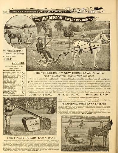 Keywords: Everything for the garden (16853275741).jpg 186 <br> PETER HENDERSON A CO NEW YORK- <br> and Country Clubs in the <br> United States <br> Among which we may mention <br> Westchester Country Club <br> Chevy Chase Club <br> Essex County Country Club <br> Ardsley Golf Club - <br> Burlingame Country Club <br> Crescent Athletic Club <br> Oyster Bay Golf Club - <br> Eagle Nest Golf Club - <br> Savannah Golf Club ˘ <br> Florida Country Club <br> Elizabeth Town CouniryClub N J <br> Jersey City Golf Club - -N J <br> Seacliff Golf Club - - N Y <br> Scarsdale Golf Club - - N Y <br> Newark Athletic Club - ˘ N J <br> Hackensack Golf Club - N J <br> Mahopac Golf Club - –  N Y <br> Ekwanock Golf Club - - Vt <br> andothers too numerous tomentlon <br> N Y <br> Md <br> N J <br> N Y <br> Cal <br> N Y <br> N Y <br> N Y <br> Ga <br> Fla <br> THE HENDERSON NEW HORSE LAWN HOWER <br> FULLY WARRANTED THE LATEST AND BEST <br> Knives can be raised or lowered instantly Side draught applicable to either side keeps horse off uncut grass <br> 'THIS is the best horse-power mower manufactured simple in construction very durable; nothing but the very best steel and <br> iron are put in it It is quickly adjusted to cut hlt;h or low and the arrangement for throwing in and out of gear and for <br> raising the knives when passing over stones rough places or roads is operated from the seat The side draught applicable <br> to either siile keeps the horse on the cut grass and prevents trampling down that which is to be mown The revolving <br> knives are high speeded making a continuous cut and leaving the siirfnce of the lawn as smooth as velvet The most <br> be iutitul lawns in this eoiintry were improved and are now maintained witli our horse mowers <br> PRICES for the HENDERSON HORSE nOVVER complete with seat shafts and side draught Strictly net; no charge for cartage or boxla <br> 30 in cut 60 00 35 in cut 67 00 40 in cut 75 00 <br> HENDERSON'S IMPROVED HORSE BOOTS <br> Made of superior lentlier improved soles will keep in place and prevent <br> horses' hoofs from cutting into soft lawns Per set of 4 9 00 <br> PHILADELPHIA HORSE LAWN SWEEPER <br> A revolving brush in front sweeps the sod clean and throws tlie sweepings <br> backward into a large box in the rear This box can be dumped without stop- <br> ping Sweeps 40 inches wide <br> 'I'he sweeper gives you a perfect lawn as soon as the sweeping is finished In- <br> stead of looking grayfor several days owing to the withered cut grass <br> If the sweeper and lawn mower are run in opposite directions the lawn will <br> be the same shade of color all over Price 67 00 net <br> THE FINLEY ROTARY LAWN RAKE <br> A thoroughly satisfactory machine for raising the lawn after mowing It gathers up <br> and throws back into the largecollecting box all cut grass leaves Rmallstones sticks <br> etc ; nothing escapes When the bo is full it is removed dumped and replaced in <br> a moment It worlcs something like a carpet sweeper excepting that the revolving <br> rakes have flexible steel teeth in place of bristle brushes these practically combing the <br> grass It can be set to rake low or high as desired For cleaning out crab grass it <br> Is Invaluable It Is simple and strong and can easily be pushed by a man Sweeps <br> 30 Inches wide; it does the work of at least three men leaving the lawn in beautiful <br> condition clean bright and green Price 12 00 net 42383275 133997 66553 Page 186 Text http //www biodiversitylibrary org/page/42383275 1902 10 5962/bhl title 66553 Henry G Gilbert Nursery and Seed Trade Catalog Collection ; Peter Henderson Co Biodiversity Heritage Library Everything for the garden 1901 Garden Stories Catalogs Flowers Peter Henderson Co Plants Ornamental Seed industry and trade Seeds Trade catalogs Vegetables U S Department of Agriculture National Agricultural Library bhl page 42383275 dc identifier http //biodiversitylibrary org/page/42383275 bhlGardenStories Garden Tools and Implements Horse Lawn Mower BHLinbloom peter henderson co plants ornamental u s department of agriculture national agricultural library bhlgardenstories garden tools and implements horse lawn mower bhlinbloom Information field Flickr posted date ISOdate 2015-03-18 Check categories 2015 August 24 CC-BY-2 0 BioDivLibrary https //flickr com/photos/61021753 N02/16853275741 2015-08-24 19 54 29 cc-by-2 0 PD-old-70-1923 Everything for the garden 1902 Photos uploaded from Flickr by Fæ using a script