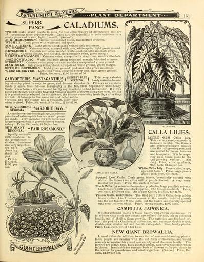 | Keywords: Everything for the garden (16854264675).jpg BKBLSHm <br> PLAIMT DEPARTIVIEIMT <br> 151 <br> SUPERB <br> FANCY- <br> CALADIUMS <br> CARYOPTERIS MASTACANTHUS Sn a <br> 'T'HESE make grand plants in pots for the conservatory or greenhouse and are <br> – becoming more popular yearly They also do splendidly in beds outdoors in a <br> shady place and in rich light free soil See cut <br> E G HENDERSON Green rose-colored spots and mottled crimson <br> WIGrHTII Dark green with white and red spots <br> MME A HEINE Light green spotted and veined pink and cream <br> ED MOREAU Crimson veins spraj-ed with rose white spots light green ground <br> KETELEERII Purplish red veins webbed white spotted light and dark green <br> PILOTE Carmine centre rose spotted deep carmine veins green margin <br> BARON DE MAMORO Crimson veins sprayed with deep rose small white dots <br> JOSE BONIFACIO White leaf pale green veins and margin blotched crimson <br> SIEBOLDII Crimson veins purplish rays red dots on splashed green ground <br> MAX KOIiB Pale green veins blood-red spots on white ground green margin <br> SETB DE SETEMBRO Light green ground pink and light green mottlings <br> WERNER MEYER Light piidc veins sprayed deeper pink light green ground <br> Price 30c each 2 50 for set of 10 <br> This very valuable <br> hardy autumn-bloom- <br> ing shrubby plant is easy to grow and blooms abundantly Flowers an exquisite <br> shade of azure blue; blooms luxuriantly in the fall from September until heavy <br> frosts when flowers are scarce and hardly anything is to be had in its color It grows <br> about 2 feet high and bears fragrant /ea /i red clusters of flowers along the stem so that <br> it is preeminently adapted for cut flowers the blooms remaining fresh days after they <br> are cut It belongs to the same natural order as the <br> Verbena and the foliage has a pleasant spicy odor <br> when bruised Price 20c each 3 for 50c 12 for 2 00 <br> BEQomA MARJORIE DAW <br> A very fine variety bearing large handsome <br> panicles of salmon pink flowers a soft pleas- <br> ing shade Very valuable for pot culture or <br> for growing on wall in greenhouse or conser- <br> vatory Price 25c each S2 50 per doz <br> ' EOON iAy FAIR ROSAMOND <br> Equally valuable <br> with the above In <br> the greenhouse it <br> attains immense <br> size very large flow- <br> ers of a <br> pleasing <br> shade of <br> pink <br> Price <br> 25c each <br> 2 50 per <br> doz <br> \ <br> CALADICMS <br> CALLA LILIES <br> LITTLE GEM CALLA <br> LITTLE GEM Calla Lily <br> This variety rarely exceeds 12 <br> inches in height The flowers <br> are correspondingly smaller <br> than the tall-growing sort and <br> are useful for loose bunches <br> and bouquets It is far supe- <br> rior as a house plant to the <br> tall-growing variety See <br> cut Piice growing plants <br> 25c each 2 25 per doz <br> \Vhite Calla Lily Pure white large <br> splendid flower Price large plants <br> irom 5-inch pots 30c each <br> Spotted Leaf Calla Dark green leaves beautifully spotted with <br> white; the flowers are white with a purple throat A very orna- <br> mental pot plant Price 20c each 3 for 50c <br> Black Calla A remarkable species producing large purplish velvety- <br> black flowers with coal-black spathe The foliage is stately Price <br> 30c each 3 00 per doz Set of four Callas 1st size for 1 00 <br> Yello-w Calla Elliottiana The first pure yellow Calla deep golden <br> flowers often 4 to 5 inches across at the mouth ; habit of growth <br> like the old favorite White Calla but the leaves are liberally spotted <br> with clear silvery white Price strong plants 2 00 each <br> CAMELLIA JAF'ONICA <br> We offer splendid plants of these bushy well-grown specimens It <br> is seldom that such fine plants are offered for sale all in splendid <br> health and of thrifty clean growth The varieties are the best ex- <br> tant the pick of a Continental collection and embrace double white <br> double pink double red and double variegated Fine bushy plants <br> Price 1 25 each set of 4 for 4 50 <br> NEW GIANT BROWALLIA <br> A most valuable addition to our list of summer-blooming plants <br> Most people are familiar with the old form of Browallia and would <br> scarcely recognize this grand new variety as of the same family The <br> flowers are indigo blue fully 2 inches across and cover the plant when <br> in bloom Invaluable for summer beds of flowers or for pot plants in <br> the winter for greenhouse and window garden See cut Price 15c <br> each 1 50 per doz 42383240 133997 66553 Page 151 Text http //www biodiversitylibrary org/page/42383240 1902 10 5962/bhl title 66553 Henry G Gilbert Nursery and Seed Trade Catalog Collection ; Peter Henderson Co NameFound Browallia NameConfirmed Browallia L EOLID 60719 NameFound Caryopteris mastacanthus NameConfirmed Caryopteris mastacanthus NameBankID 5828792 NameFound Verbena NameConfirmed Verbena subser Pseudoracemosae N O'Leary EOLID 24001436 Biodiversity Heritage Library Everything for the garden 1901 Garden Stories Catalogs Flowers Peter Henderson Co Plants Ornamental Seed industry and trade Seeds Trade catalogs U S Department of Agriculture National Agricultural Library bhl page 42383240 dc identifier http //biodiversitylibrary org/page/42383240 bhlGardenStories Caladiums Calla Lilys Giant Browallia BHLinbloom peter henderson co plants ornamental u s department of agriculture national agricultural library bhlgardenstories calla lilys giant browallia bhlinbloom Information field Flickr posted date ISOdate 2015-03-18 Check categories 2015 August 24 CC-BY-2 0 BioDivLibrary https //flickr com/photos/61021753 N02/16854264675 2015-08-24 20 56 34 cc-by-2 0 PD-old-70-1923 Everything for the garden 1902 Photos uploaded from Flickr by Fæ using a script |