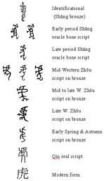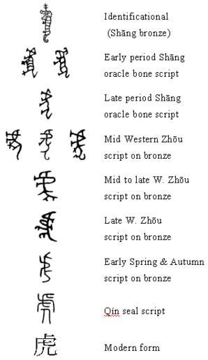 Keywords: Evolution of the Chinese character hu3 虎 tiger.gif Chart of the evolution of the Chinese character 虎 hu3 'tiger' created by Kent M Suárez Shang identificational bronze tiger is a CGI by Kent M Suárez to faithfully reproduce a Shang bronze graph from a rubbing made available by the Bronze Inscription Research Team BIRT under the Institute of History and Philology of the Academia Sinica Remaining oracle bone bronze and seal forms are TYPED using fonts made available for public use by the Academia Sinica's Chinese Document Processing Laboratory CDPL under the Institute of Information Science Own Dragonbones 2008-05-28 Public domain none Bronze inscriptions 虎 Chinese character for tiger |