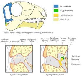 Keywords: Evolution of mammalian auditory ossicles.png uk Виникнення слухових кісточок ссавців а исунку зве ху зоб ажена будова че епа п едставника д евніх синапсид еволюційних п едків ссавців Biarmosuchus зчленівна та квад атна кістки входять до складу суглобу щелепи У ссавців знизу сп ава ці кістки пе етво ились на слухові кісточки молоточок і куваделко відповідно В сучасних ептилій знизу зліва наявна тільки одна слухова кісточка - ст емінце 2013-07-13 19 06 56 own Zlir'a cc-zero Uploaded with UploadWizard Ossicles |
