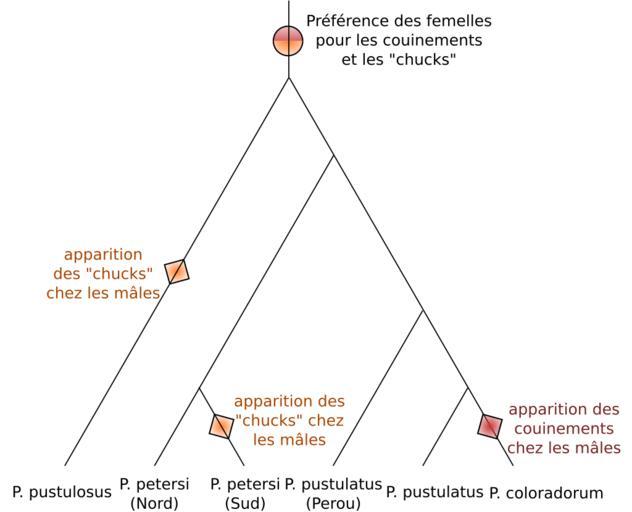 | Keywords: Evolution of songs and female preference of Physalaemus.svg en Evolutive tree of males calls and females preference for this calls in the Physalaemus pustulosus species group From Shaw K 1995 fr Arbre montrant l'évolution des cris mâles et de la préference des femelles pour ces cris chez Physalaemus pustulosus et les espèces proches D'après Shaw K 1995 own Gagea From Kerry Shaw « Phylogenetic tests of the sensory exploitation model of sexual selection » in TREE vol 10 no 3 1995 p 117-120 Physalaemus Phylogenetic trees Sexual selection SVG diagrams in French |