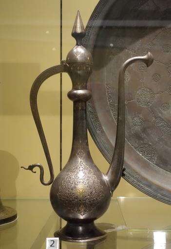 Keywords: Ewer with a handle and lid, Iran, 18th century, engraved steel, inlaid with gold wire - Royal Ontario Museum - DSC04747.JPG en Exhibit in the Royal Ontario Museum Toronto Ontario Canada This work is old enough so that it is in the public domain Photography was permitted in the museum without restriction 2013-10-08 17 17 20 own Daderot cc-zero Uploaded with UploadWizard Metalwork of Iran in the Royal Ontario Museum |