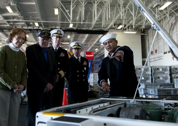 Keywords: Ex-president Carter visits USS Carl Vinson 130222-N-TZ605-982.jpg en Aviation Support Equipment Technician 2nd Class Jeffrey Rollon shows former President Jimmy Carter former first lady Rosalynn Carter and former Secretary of the Navy John Dalton various aircraft transport vehicles as part of a static display during a tour in the hangar bay aboard the aircraft carrier USS Carl Vinson The Carters and Dalton visited Carl Vinson with more than 200 members of The Carter Center 2013-02-22 CVN 70 https //www dvidshub net/image/875062 130222-N-TZ605-982 2013-02-27 05 06 CORONADO CA US PD-USGov-Military-Navy USS Carl Vinson CVN-70 Images from DoD uploaded by Fæ Rosalynn and Jimmy Carter |