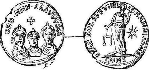 Keywords: Exagium solidi.jpg en A struck exagium coin weight of the emperors Arcadius Honorius and Theodosius II legend surrounding the imperial busts DDD NNN AAA VVV GGG Dominorum nostrorum Augustorum and surrounding the Justitia figure EXAG SOL SVB V INL IOHANNI COM S L - CONS Exagium solidi sub viro inlustri Iohanni comiti sacrarum largitionum nl Een opvallend exagium muntgewicht van de keizers Arcadius Honorius en Theodosius II rond de keizerlijke bustes leest men DDD NNN AAA VVV GGG Dominorum nostrorum Augustorum rechts en rond de figuur van Justitia EXAG SOL SVB V INL IOHANNI COM S L - CONS Exagium solidi sub viro inlustri Iohanni comiti sacrarum largitionum http //dagr univ-tlse2 fr/sdx/dagr/feuilleter xsp tome 2 partie 1 numPage 880 nomEntree EXACTUS vue imagesass E Babelon art exagium in C Daremberg - E Saglio edd Le Dictionnaire des Antiquités Grecques et Romaines II 1 Parijs 1892 p 876 1892 PD-old Dictionnaire des antiquités grecques et romaines by Daremberg and Saglio Coin weights |