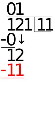 Keywords: Example 121 divided by 11 step 7.svg en Example 121 divided by 11 step 7 2012-06-20 own Averater cc-zero SVG calculus examples Division mathematics Uploaded with UploadWizard SVG files by Averater