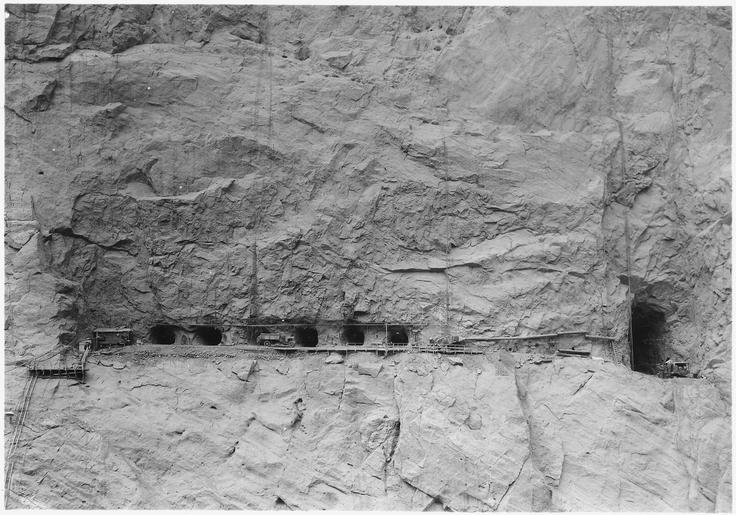 | Keywords: Excavation for Nevada canyon wall outlet works and conduits. View looks directly against canyon wall and shows the... - NARA - 293798.tif Scope and content Photograph from Volume Two of a series of photo albums documenting the construction of Hoover Dam Boulder City Nevada General notes 293798 Local identifier Department of the Interior Bureau of Reclamation Engineering and Research Center 05/18/1981 - 03/04/1988 NARA's Rocky Mountain Region Denver NRGA Building 48 Denver Federal Center West 6th Avenue and Kipling Street Denver CO 80225-0307 1933-02-10 Record group Record Group 115 Records of the Bureau of Reclamation 1889 - 2008 Record group ARC 444 Photograph albums compiled 1903 - 1972 Series ARC 293611 File unit File unit ARC Variant control numbers NAIL Control Number NRG-115-CONSTPHO85006-BC21526 yes Other versions <gallery> File Excavation for Nevada canyon wall outlet works and conduits View looks directly against canyon wall and shows the - NARA - 293798 jpg jpg </gallery> NARA-cooperation PD-USGov Construction of the Hoover Dam 1933 in the United States Adits in the United States NARA TIF images with categorized JPGs |