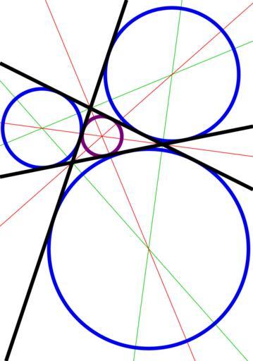 Keywords: Excircles.svg A triangle with its incircle excircles and angle bisectors Excircles png 2013-07-17 Excircles png AxelBoldt SVG version this file Patrick87 Information field http //www emis de/misc/software/gclc/ GCLC source hidden left click to expand <source lang text> The three vertices of the triangle point A 25 70 point B 20 55 point C 45 60 They define three lines line a B C line b A C line c A B The three internal angle bisectors bis bis_A B A C bis bis_B A B C bis bis_C B C A The three external angle bisectors They are perpendicular to the internal ones perp extbis_A A bis_A perp extbis_B B bis_B perp extbis_C C bis_C The centers of the in- and excircles intersec incenter bis_A bis_B intersec a_excenter bis_A extbis_B intersec b_excenter bis_B extbis_C intersec c_excenter bis_C extbis_A The incircle Find a point on the incircle by going perpendicular from the incenter to b for instance perp dummy_line incenter b intersec touch dummy_line b circle incircle incenter touch The excircles perp dummy_line a_excenter a intersec touch dummy_line a circle a_excircle a_excenter touch perp dummy_line b_excenter b intersec touch dummy_line b circle b_excircle b_excenter touch perp dummy_line c_excenter c intersec touch dummy_line c circle c_excircle c_excenter touch Now draw everything dim 70 100 color 0 200 0 drawline extbis_A drawline extbis_B drawline extbis_C color 255 0 0 drawline bis_A drawline bis_B drawline bis_C linethickness 3 color 120 0 120 drawcircle incircle color 0 0 240 drawcircle a_excircle drawcircle b_excircle drawcircle c_excircle color 0 0 0 drawline a drawline b drawline c </source> Incircle and excircles Images with GCLC source code Incenter |