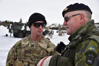 | Keywords: select people NAMSOS, Norway - Swedish Col. Lars Karlsson speaks with Cpt. Jason Bender, company commander of 2nd Battalion, 7th Infantry Regiment, 1st Armored Brigade Combat Team, 3rd Infantry Division, during Exercise Cold Response 16, a Norwegian-led cold weather training exercise. U.S. Army units bundled up and headed to Norway to join 13 countries for intense cold weather training at Exercise Cold Response 16. Cold Response is a regularly scheduled Norwegian-led joint multinational exercise with a focus on high-intensity operations in winter conditions. This year is the first time the 13 participating nations are joined by the U.S. Army. (Photo by U.S.Army Sgt. 1st Class Crista Mary Mack) NAMSOS, Norway - Swedish Col. Lars Karlsson speaks with Cpt. Jason Bender, company commander of 2nd Battalion, 7th Infantry Regiment, 1st Armored Brigade Combat Team, 3rd Infantry Division, during Exercise Cold Response 16, a Norwegian-led cold weather training exercise. U.S. Army units bundled up and headed to Norway to join 13 countries for intense cold weather training at Exercise Cold Response 16. Cold Response is a regularly scheduled Norwegian-led joint multinational exercise with a focus on high-intensity operations in winter conditions. This year is the first time the 13 participating nations are joined by the U.S. Army. (Photo by U.S.Army Sgt. 1st Class Crista Mary Mack) |
