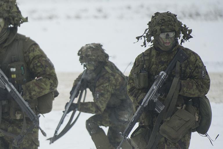 | Keywords: Estonian soldiers under fire during the mock fighting on the distinguished visitors day during Exercise Iron Sword near Vilnius, Lithuania on 2nd December 2016. NATO Photo by SSgt Dan Bardsley GBR A 0R7
