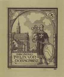 | Keywords: Exlibris-Felix-Dobschütz.jpg Exlibris of Felix von Dobschütz Oppeln Silesia 1919 Es zeigt den Johanniter-Ritter mit dem Dobschütz-Wappenschild und 3 Straußenfedern auf seinem Helm neben der Oppelner Stadtpfarrkirche der langjährigen Wirkungsstätte des Superintendenten Zinkografie in Grün 92 x 79 mm Zeichner Lorenz M Rheude Signum libri decorum 1919 Lorenz M Rheude PD-old Knights in supporters Historical images of Opole Historical images of Holy Trinity Church in Opole Lorenz M Rheude Coats of arms by Lorenz M Rheude Coats of arms of Dobschütz family Coats of arms of Germany to be classified |