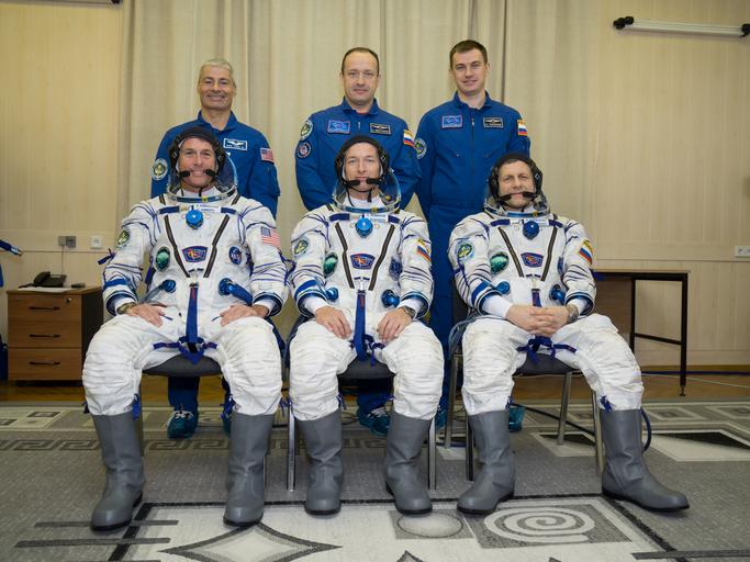 MAKE A MEME View Large Image Expedition 49 prime crew members, seated in their Sokol suits, Shane Kimbrough of NASA, left, Soyuz commander Sergey Ryzhikov, center, and flight engineer Andrey Borisenko of Roscosmos, right, and backup crew members, standing, Mark Vande ...