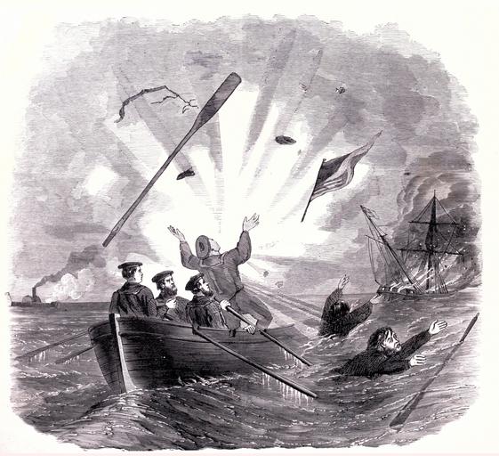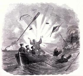 | Keywords: drawing (from Frank Leslie's Illustrated History of the Civil War..., edited by Louis Shepheard Moat, Published by Mrs. Frank Leslie, New York, 1895) "Few incidents in the war displayed more courage and coolness than the action of Fog Boatswain A. W. Pomeroy, of the United States frigate Niagara, in burning the Confederate brig Nonsuch near New Orleans. After setting the vessel on fire the Federal sailors were pulling back to the Niagara, when a shell struck the boat, throwing two of the officers in the water. The men were saved by a cutter dispatched from the Niagara." (from Frank Leslie's Illustrated History of the Civil War..., edited by Louis Shepheard Moat, Published by Mrs. Frank Leslie, New York, 1895) "Few incidents in the war displayed more courage and coolness than the action of Fog Boatswain A. W. Pomeroy, of the United States frigate Niagara, in burning the Confederate brig Nonsuch near New Orleans. After setting the vessel on fire the Federal sailors were pulling back to the Niagara, when a shell struck the boat, throwing two of the officers in the water. The men were saved by a cutter dispatched from the Niagara." |