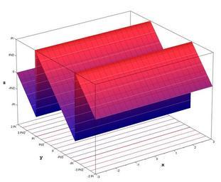 Keywords: Exponential Function Argument.png Diagram of the argument of the exponential function in the complex plane The plot is given by <math>z \operatorname arg \left \exp \left x + i y \right \right </math> Own drawing Plotted in MuPAD code given below 2007-04-25 Inductiveload See Exponential function for related graphics MuPAD Code <pre> q arg exp x+I y conts 10 projectionlevel -5 ylimit 2 PI xlimit 3 submeshlevel 0 colourfunc zip RGB VenetianRed RGB DarkBlue a b -> q x y +PI / 6 a - q x y -PI / 6 b funcplot plot Function3d q x y x -xlimit xlimit y -ylimit ylimit Mesh 23 23 Submesh submeshlevel submeshlevel LineColor RGB Black 0 4 LineWidth 0 15 AdaptiveMesh 10 FillColorFunction colourfunc AxesTitleFont Courier New Bold 14 ViewingBoxZRange -5 PI YTicksNumber None YTicksAt -3 PI/2 -3 PI/2 -PI -PI -PI/2 -PI/2 -2 PI -2 PI 0 0 PI/2 PI/2 PI PI 3 PI/2 3 PI/2 2 PI 2 PI ZTicksNumber None ZTicksAt -PI -PI -PI/2 -PI/2 0 0 PI/2 PI/2 PI PI contours plot modify funcplot ZContours -3 14 3 14 step 0 7853 LineWidth 0 2 LineColor RGB Gray90 0 5 XLinesVisible FALSE YLinesVisible FALSE Filled FALSE projcontours plot Transform3d 0 0 projectionlevel 1 0 0 0 1 0 0 0 0 plot modify funcplot ZContours -3 14 3 14 step 0 7853 LineWidth 0 2 LineColorType Dichromatic LineColor RGB VenetianRed 0 99 LineColor2 RGB DarkBlue 0 99 XLinesVisible FALSE YLinesVisible FALSE Filled FALSE camera plot Camera -40 -120 60 -0 5 -1 -0 5 0 1 ploteverything plot Canvas funcplot contours projcontours Width 8 5 unit inch Height 7 unit inch camera plot ploteverything </pre> Surface plots of complex exponential function Images with MuPad source code |