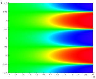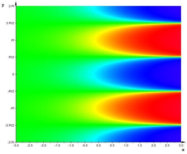 Keywords: Exponential Function (Real Part) Density.png Diagram of the real part of exponetial function in the complex plane The density is given by <math>z \operatorname Re \left \exp \left x + i y \right \right </math> Blue represents high values red represents low values Please note that the colouring is non-linear it is based on the ArcTan function see the code below and therefore a similar change in hue does NOT necessarily denote a similar change in value Own drawing Plotted in MuPAD 2007-04-20 Inductiveload MuPAD Code <pre> f Re exp x+I y ylimit 2 PI xlimit 3 hsv x y z -> RGB fromHSV 120+85 arctan z 1 1 cplot plot Density f x -xlimit xlimit y -ylimit ylimit Mesh 800 800 AxesTitleFont Courier New Bold 14 TicksLabelFont Arial 10 FillColorFunction hsv YTicksNumber None YTicksAt -3 PI/2 -3 PI/2 -PI -PI -PI/2 -PI/2 -2 PI -2 PI 0 0 PI/2 PI/2 PI PI 3 PI/2 3 PI/2 2 PI 2 PI XTicksDistance 0 5 plot cplot Axes Frame Width 8 5 unit inch Height 7 unit inch </pre> Complex exponential function Hue MuPad diagrams |