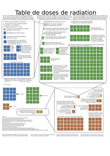 | Keywords: Exposure chart-fr-XKCD.svg  Chart of radiation exposure SVG version of http //blog xkcd com/2011/03/19/radiation-chart/ Tableau de doses radiactives Adapté de http //blog xkcd com/2011/03/19/radiation-chart/ http //xkcd com/radiation/ converted to SVG by Rama mld Source of the data according to http //xkcd com/radiation/sources html xkcd website Source des informations selon le http //xkcd com/radiation/sources html site de xkcd http //www nrc gov/reading-rm/doc-collections/cfr/part020/ http //www nrc gov/reading-rm/doc-collections/fact-sheets/tritium-radiation-fs html http //www nema ne gov/technological/dose-limits html http //www deq idaho gov/inl_oversight/radiation/dose_calculator cfm http //www deq idaho gov/inl_oversight/radiation/radiation_guide cfm http //mitnse com/ http //www mext go jp/component/a_menu/other/detail/__icsFiles/afieldfile/2011/03/18/1303727_1716 pdf http //blog vornaskotti com/2010/07/15/into-the-zone-chernobyl-pripyat/ http //dels-old nas edu/dels/rpt_briefs/rerf_final pdf http //en wikipedia org/wiki/Sievert 2011-04-26 Randall Munroe From http //xkcd com/radiation/ original page I waive all copyright to this chart and place it in the public domain so you are free to reuse it anywhere with no permission necessary However keep in mind that I am not a radiation expert and this chart is intended for general public informational use only Original English PNG - English SVG - Français SVG CC0 Radioprotection Xkcd |