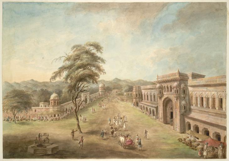 | Keywords: Exterior view of the gateway and facade of the chowk at Kankhal, 1814.jpg  artwork Institution British Library from the Original Watercolour of street view of Kankal from 'Views by Seeta Ram from Mohumdy to Gheen Vol V' produced for Lord Moira afterwards the Marquess of Hastings by Sita Ram between 1814-15 Marquess of Hastings the Governor-General of Bengal and the Commander-in-Chief r 1813-23 was accompanied by artist Sita Ram flourished c 1810-22 to illustrate his journey from Calcutta to Delhi between 1814-15 Kankal is a suburb of Haridwar on the Ganges river in Uttar Pradesh View of the exterior of the gateway and facade of the chowk at Kankal with more marketing going on and with hills in the distance Inscribed below 'Another view of Kunkal ' PD-old-100-1923 British Library India Office paintings and furniture collection Historical images of Haridwar 1814 in India Sita Ram 1810s paintings from India Forts in India in art |