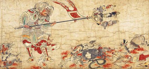 Keywords: Extermination of Evil Sendan Kendatsuba crop.jpg Artist Sendan Kendatsuba 栴 乾闥婆 せんだんけんだつば Sendankendatsuba century 12 Color on paper cm 25 8 77 2 Nara National Museum Nara Japan Part of the set of five hanging scrolls Extermination of Evil depicting benevolent deities who expel demons of plague This scroll was originally part of a handscroll known as the second edition of the Masuda family Hell Scroll before being cut into sections after World War II The text on the scroll explains the acts of the god in exterminating evil Sendan Kendatsuba originally an Indian god of music was a king of the Kendatsuba and thereby a member of the Eight Legions 八部衆 and the 28 legions 二十八部衆 According to the Lotus Sutra he is one of the 33 manifestations of Kannon Bosatsu and the central figure of the Dōjikyō Mandara 童子経曼荼羅 Here he is depicted in human guise hoisting the heads of evil animals and demons on a trident The set of five scrolls has been designated as National Treasure of Japan in the category paintings L'extermination du mal Portion de l'un des cinq Kakemono représentant les divinités bénéfiques expulsant les démons de la peste Ce rouleau était au départ une partie d'un rouleau plus grand connu sous le nom de La seconde édition de l'enfer de la famille Masuda qui a été découpé après la seconde guerre mondiale Le texte décrit les actes des dieux exterminant le mal Shōki est un exorciste légendaire originaire de Chine qui protégeait l'empereur Tang Xuanzong des démons du mal Il est décrit avec de grand yeux et une barbe épaisse une robe noire un grand chapeau et de grandes bottes L'ensemble des cinq rouleaux a été désigné trésor national du Japon dans la catégorie des peintures http //www emuseum jp/detail/100247/002 word d_lang en s_lang zh class 1 title c_e region era cptype owner pos 1 num 7 mode detail century Tokyo National Museum Emuseum 1106 painting 205 Other versions 150px PD-old-100 derivative works Extermination of Evil collage jpg Extermination of Evil |