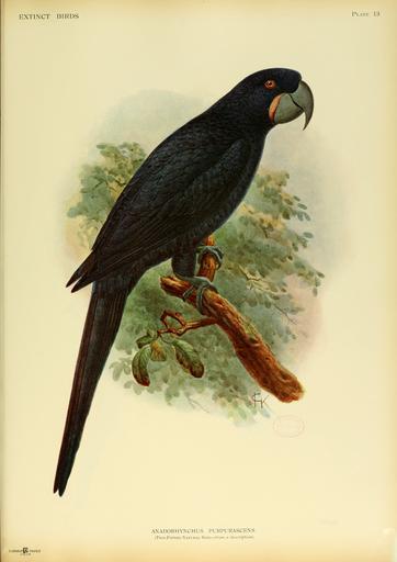 | Keywords: Extinctbirds1907 P13 Anodorhynchus purpurascens0307.png en Anodorhynchus purpurascens was described by Rothschild and featured in his book Extinct Birds published in 1907 but there is very little evidence to support it as separate species Rothchild named the species because violet macaws were said to have inhabited the island of Guadeloupe; however they were probably imported Hyacinth Macaws from the mainland of South America Extinct birds an attempt to unite in one volume a short account of those birds which have become extinct in historical times that is within the last six or seven hundred years to which are added a few which still exist but are on the verge of extinction By Lionel Walter Rothschild 2nd Baron Rothschild 8 February 1868 “ 27 August 1937 http //www archive org/details/extinctbirdsatte00roth Creator John Gerrard Keulemans 1907 Not in copyright Public Domain Original PD-old-100 Extinct Birds Rothschild book 13 John Gerrard Keulemans Anodorhynchus purpurascens |