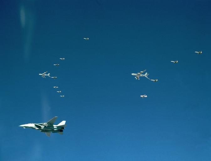 | Keywords: F-14A VF-33 Operation Desert Storm Strike Package Tanking.jpg en F/A-18 Hornet and A-6E Intruder aircraft from Carrier Air Wing 1 CVW-1 conduct an in-flight refueling with a pair of U S Air Force KC-135R Stratotanker aircraft while en route to their target during Operation Desert Storm A Fighter Squadron 33 VF-33 F-14A Tomcat aircraft also from CVW-1 is in the foreground CVW-1 is based aboard the aircraft carrier USS AMERICA CV 66 1991-01-01 www DefenseImagery mil US Navy PD-USGov Uploaded with UploadWizard Aircraft formation flight of F-14A Tomcat Aerial photographs of F-14 Tomcat in flight KC-135R Stratotanker Fighter Squadron 33 United States Navy Gulf War 1990-1991 A-6E Intruder |