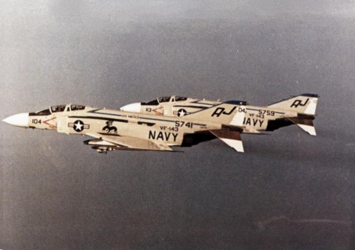 | Keywords: F-4J Phantoms VF-143 in flight 1974.jpg Two U S Navy McDonnell F-4J-34-MC Phantom II BuNo 155741 155759 from Fighter Squadron VF-143 Pukin' Dogs in flight in 1974 VF-143 was assigned to Carrier Air Wing 8 CVW-8 aboard the aircraft carrier USS America CVA-66 for a deployment to the Mediterranean Sea from 3 January to 3 August 1974 Official U S Navy photograph http //navysite de/cruisebooks/cv66-74/067 jpg from the USS America CVA-66 http //navysite de/cruisebooks/cv66-74/index html 1974 cruise book 1974 USN PD-USGov-Military-Navy F-4J Phantom II Aerial photographs of F-4 Phantom II in flight Fighter Squadron 143 United States Navy |
