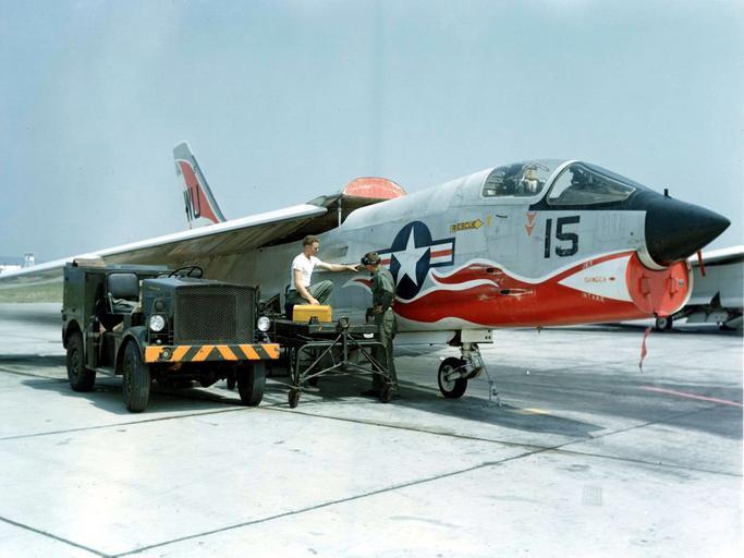 Keywords: F-8 Crusader of VMF-334 on the ground.jpeg A U S Marine Corps Vought F-8C Crusader from Marine Fighter Squadron 334 VMF-334 Falcons http //collections naval aviation museum/emuwebdoncoms/pages/doncoms/AdvQuery php U S Navy National Museum of Naval Aviation photo No http //collections naval aviation museum/emuwebdoncoms/pages/doncoms/Display php irn 46624 QueryPage 2Femuwebdoncoms 2Fpages 2Fdoncoms 2FAdvQuery php 1996 253 7357 032 s 1960 U S Navy PD-USGov-Military-Navy F-8C Crusader Marine Fighter Attack Squadron 334 |